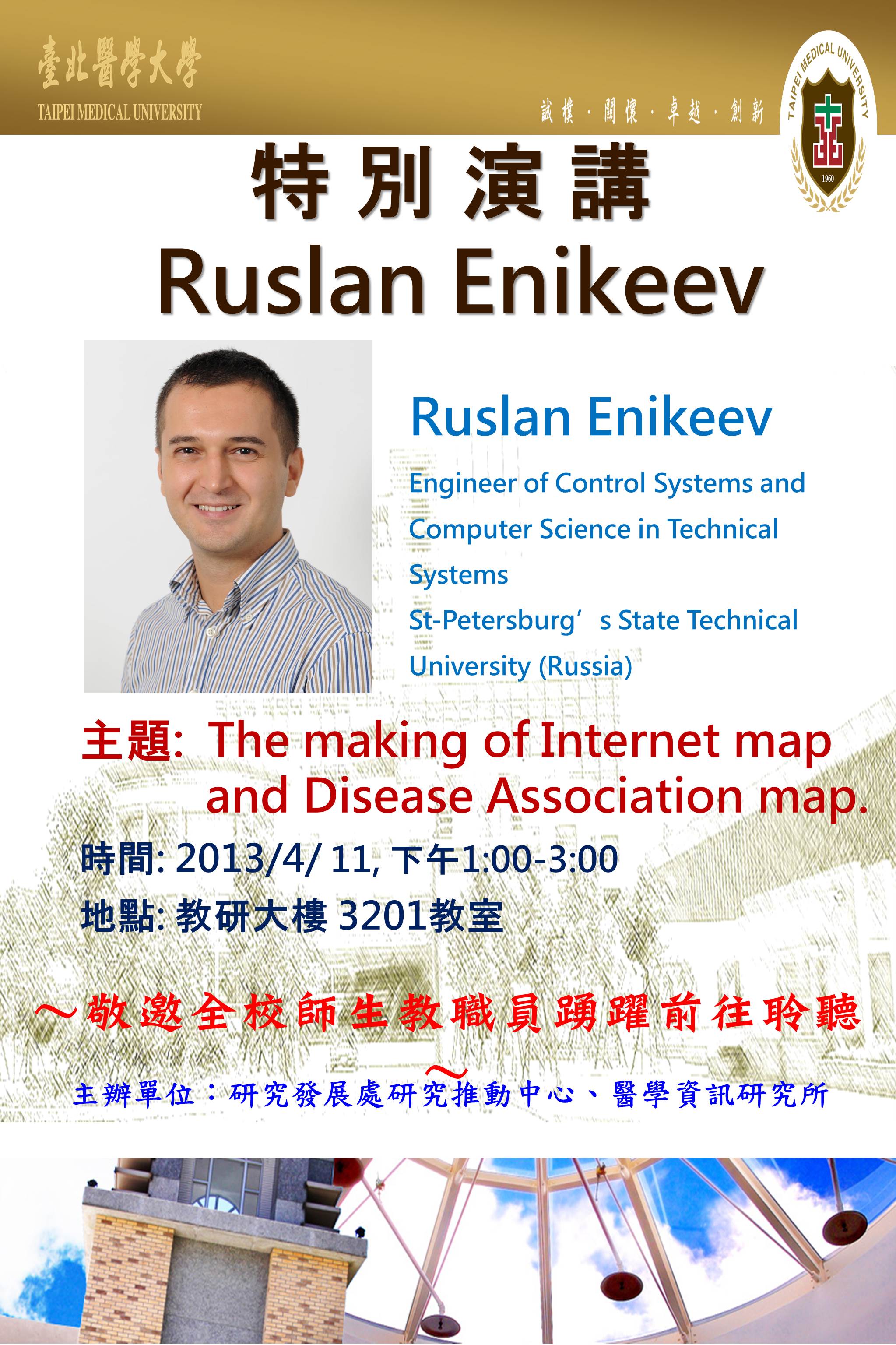 | 活動說明 | 名稱:特別演講 - Ruslan Enikeev 日期:102年04月11日(星期四)13:00~15:00 地點:教研大樓3201教室 主講人:Ruslan Enikeev 講題:The making of Internet map and Disease Association map 主辦單位:研發處研究推動中心、醫學資訊研究所 |