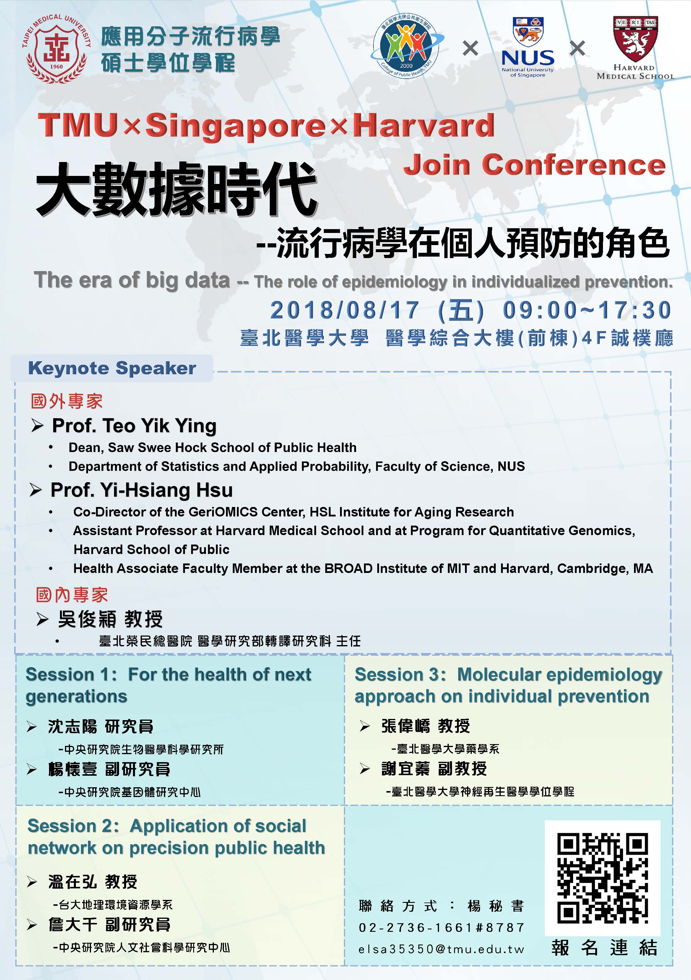 | 活動說明 | 大數據分析是現今健康科學中很重要的工具,因應大數據AI時代來臨,巨量遺傳數據、空間流行病學、健保資料庫等應用,在精準公共衛生的發展扮演重要的角色,本學程邀請國內外產學相關領域學者專家(哈佛大學、新加坡大學、中研院等),於國際論壇發表最新發展,此次論壇旨在提供 最新知識、鼓勵經驗交流、並加強學術和應用之間的連結,歡迎對大數據有興趣的研究同好踴躍參加! |