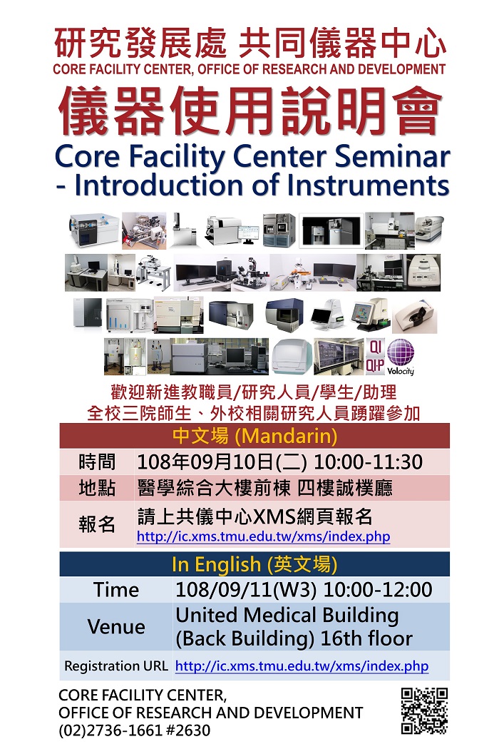 | 活動說明 | 您好 共同儀器中心說明會另有108/09/10中文場 若需中文場請至 108學年度研發處共儀中心-儀器使用說明會-中文場 謝謝您 Welcome to join 108/09/11-Core Facility Center Seminar - Introduction of Instruments (English) (10:00-12:00) Time:108/09/11 10:00-12:00 Venue:United Medical Building (Back Building) 16th floor Registration Dead line:108/09/10 Registration URL: http://ic.xms.tmu.edu.tw/xms/index.php?view=content_show&id=2521 Due to the limited size of the place, please register as soon as possible. If you want to know any other things, please contact us, thank you~ |