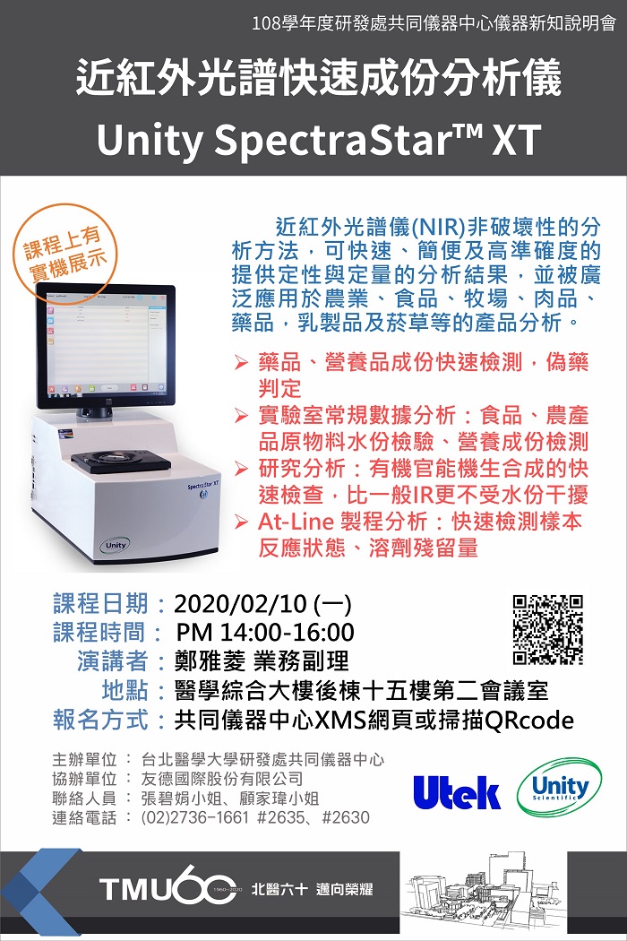 | 活動說明 | 敬邀參加 109/02/10-儀器新知-近紅外光譜快速成份分析儀(中文)(14:00-16:00) 課程時間:109年02月10日 14:00-16:00 課程地點:醫綜大樓後棟15樓第二會議室 報名截止日期:109年02月09日 報名請至:http://ic.xms.tmu.edu.tw/xms/index.php?view=content_show&id=2610 由於場地大小有限,請盡速報名。 另外請需要認列教發系統學習時數的老師(教學)/職員(儀器與設備) 請記得於教職員工學習發展系統上報名 附上連結http://training.tmu.edu.tw/Index.aspx 有任何疑問或指教, 煩請您不吝與我們連絡, 謝謝您~ |