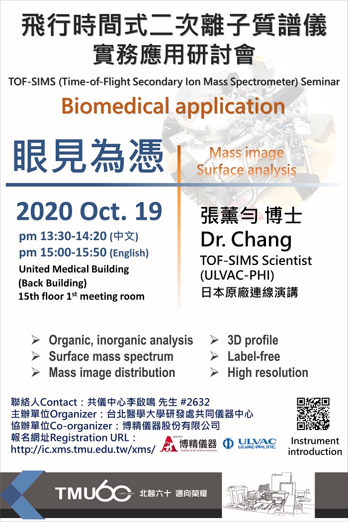 | 研討會名稱 | 109/10/19-飛行時間式二次離子質譜儀實務應用研討會13:30-14:20(中文) 15:00-15:50(English) |