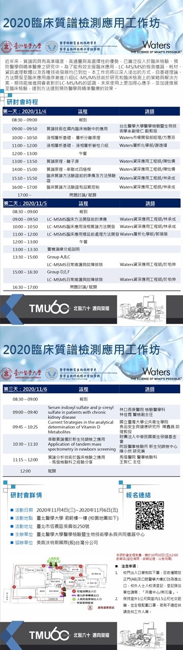 | 研討會名稱 | 109/11/04-11/06-2020臨床質譜檢測應用工作坊(中文)(08:30-17:00) |