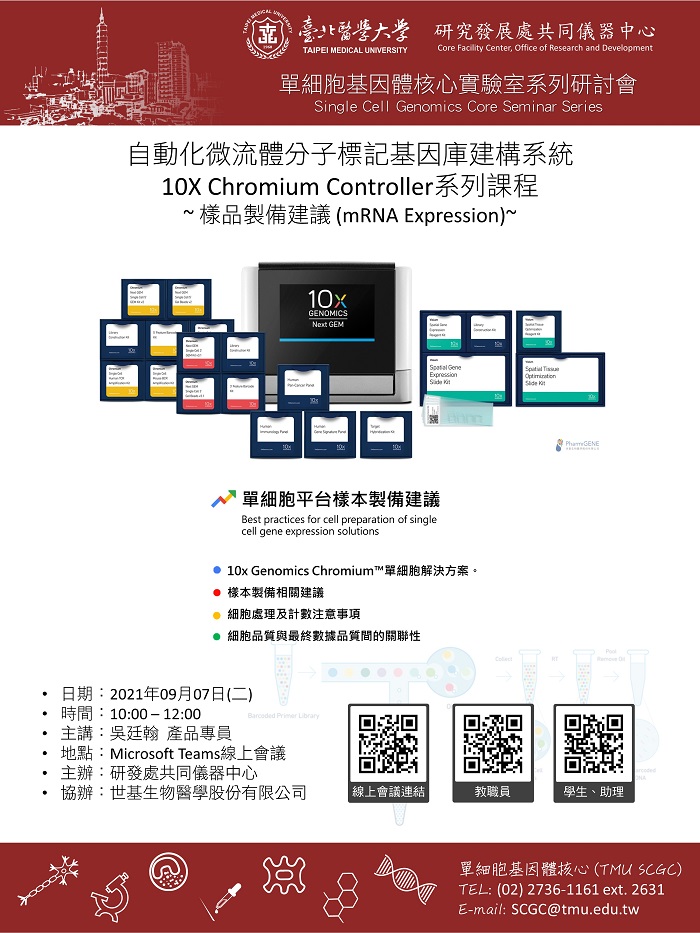 | 研討會名稱 | 110/09/07-單細胞基因體核心實驗室系列研討會-自動化微流體分子標記基因庫建構系統 10X Chromium Controller系列課程-樣品製備建議(mRNA Expression)(中文)(10:00-12:00) |