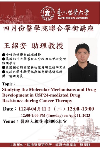 | 研讨会名称 | 四月份医學院學术月会--Studying the Molecular Mechanisms and Drug Development in USP24-mediated Drug Resistance during Cancer Therapy |