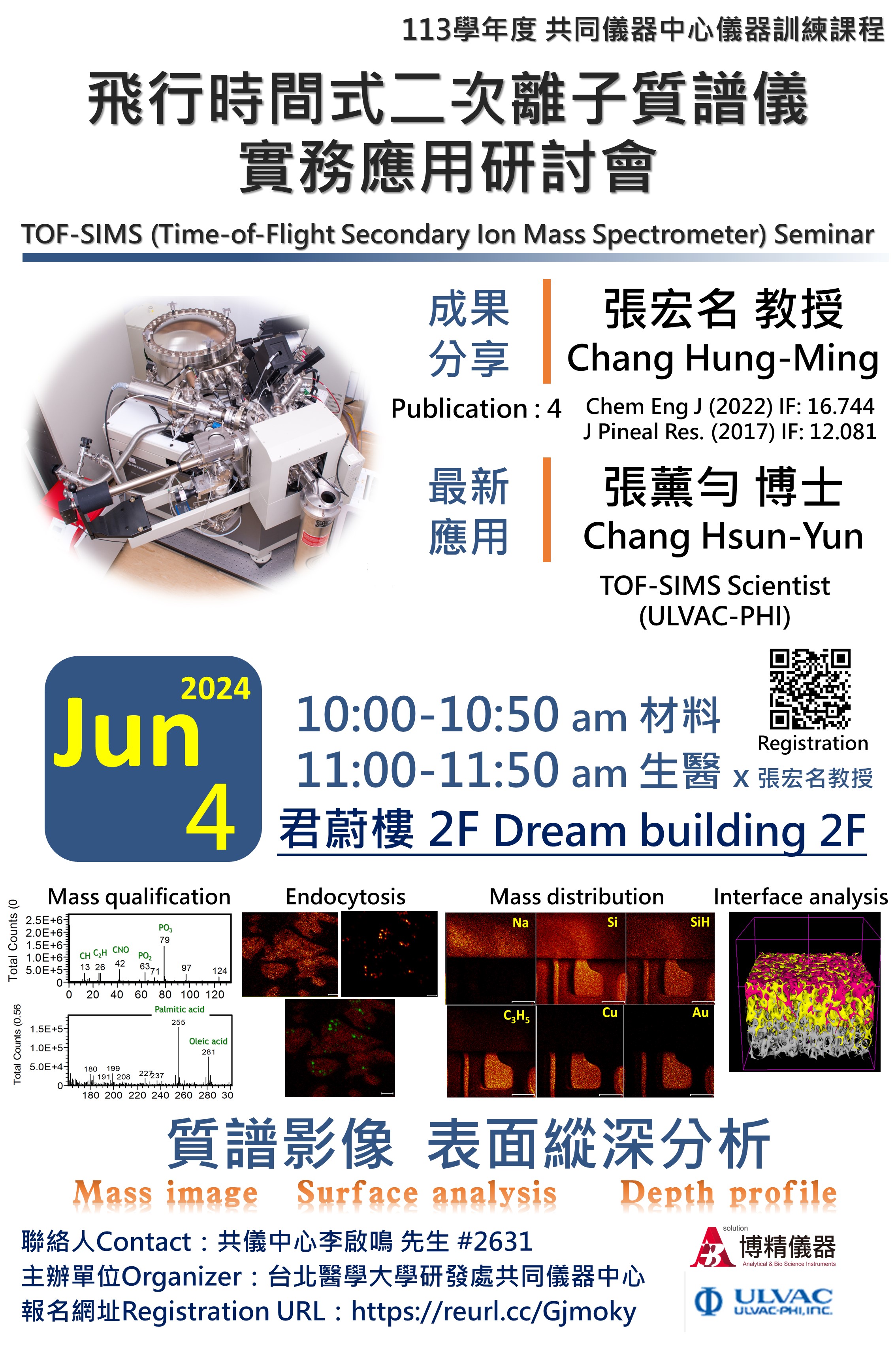 | 研討會名稱 | 113/6/04-112學年度飛行時間式二次離子質譜儀實務應用研討會(材料應用與生醫應用)(中文)(10:00-12:00) |