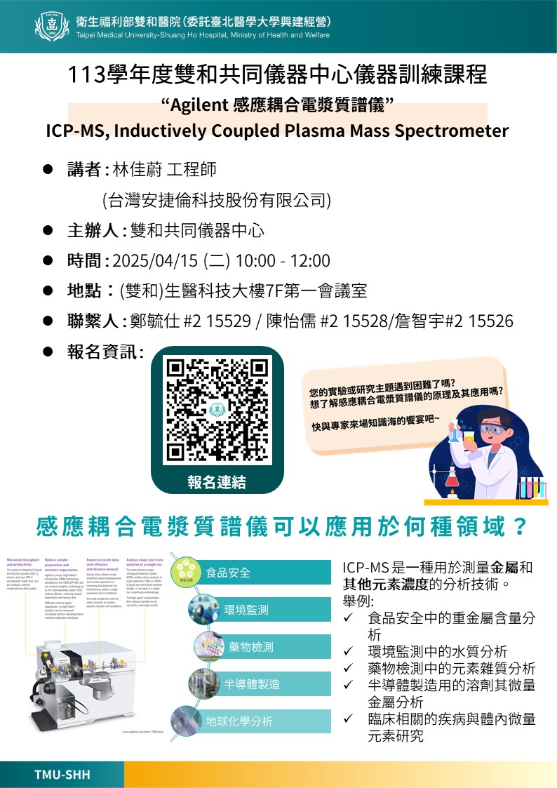 研討會名稱113學年度雙和共同儀器中心儀器訓練課程 – 感應耦合電漿質譜儀Agilent 7800 ICP-MS (雙和)