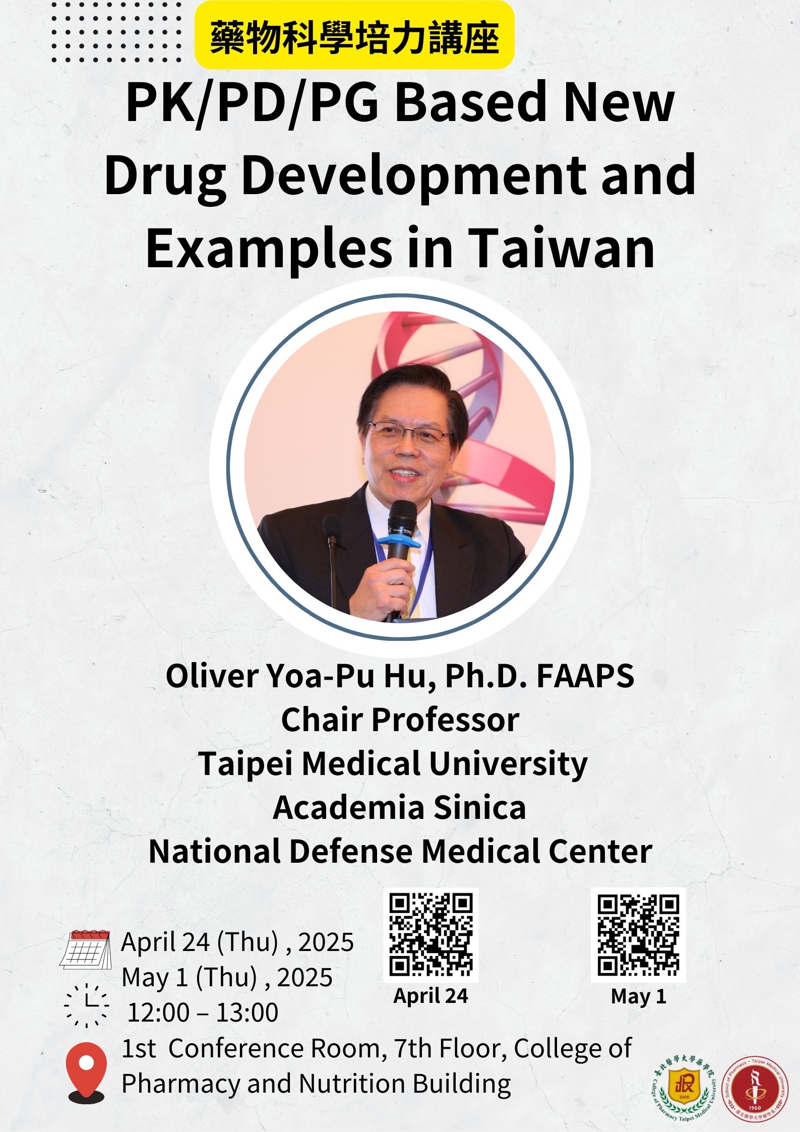 | 活動說明 | 【藥物科學培力講座】 (全英授課演講) 時間:2025年4月24日(四) 中午12:00-13:00 地點:藥學暨營養大樓七樓第一會議室 演講者:胡幼圃 講座教授 美國國家發明家學院院士/台北醫學大學 中研院客座講座/國防醫學院榮譽教授/台大兼任教授 演講題目:PK/PD/PG Based New Drug Development and Examples in Taiwan |