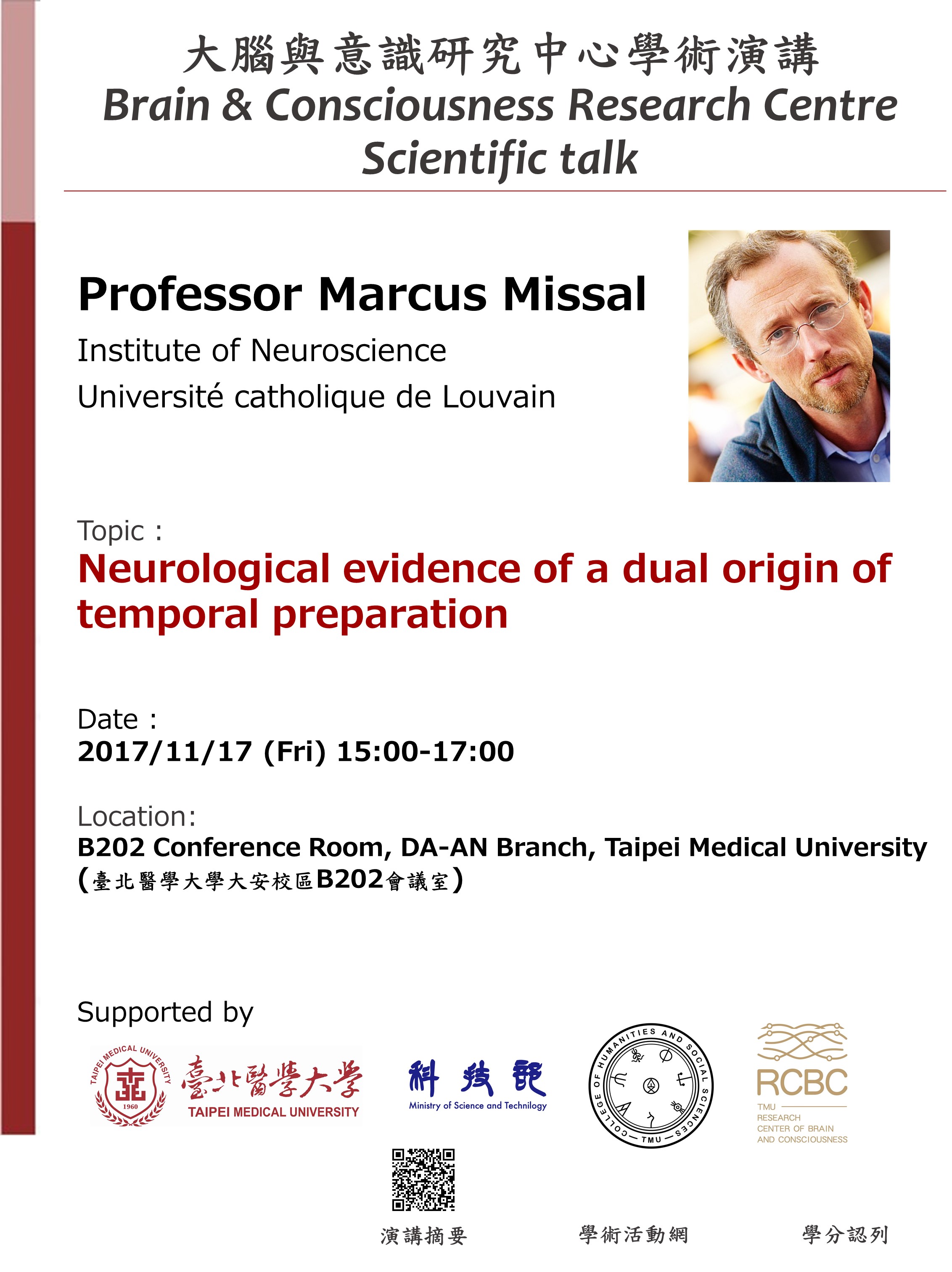 | 研討會名稱 | 106/11/17-大腦與意識研究中心-1061學術演講(4)Professor Marcus Missal學術演講 (15:00-17:00) |