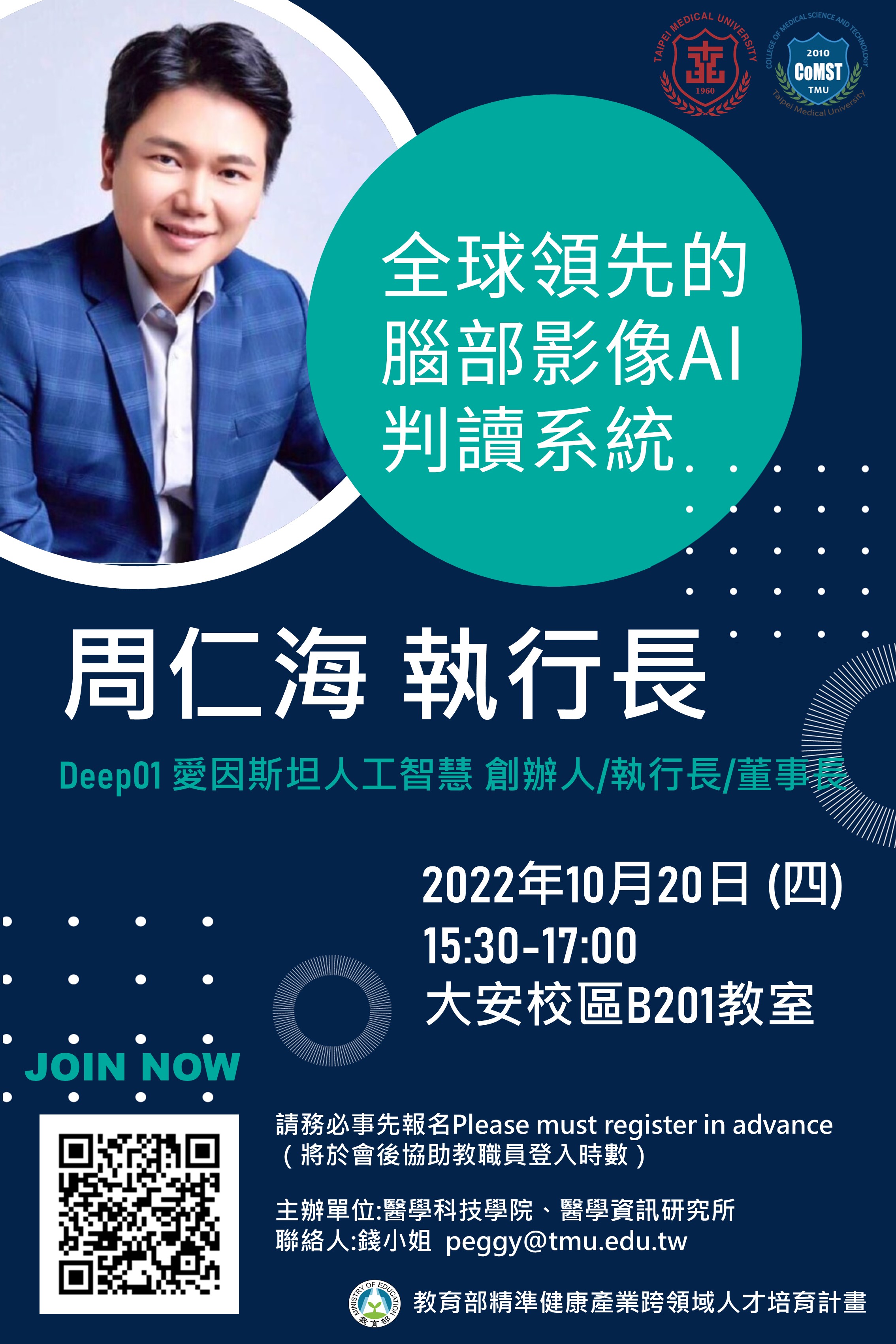 | Seminar Title | 111/10/20(四)醫科院專題演講/Deep01周仁海執行長《全球領先的腦部影像AI判讀系統》 |