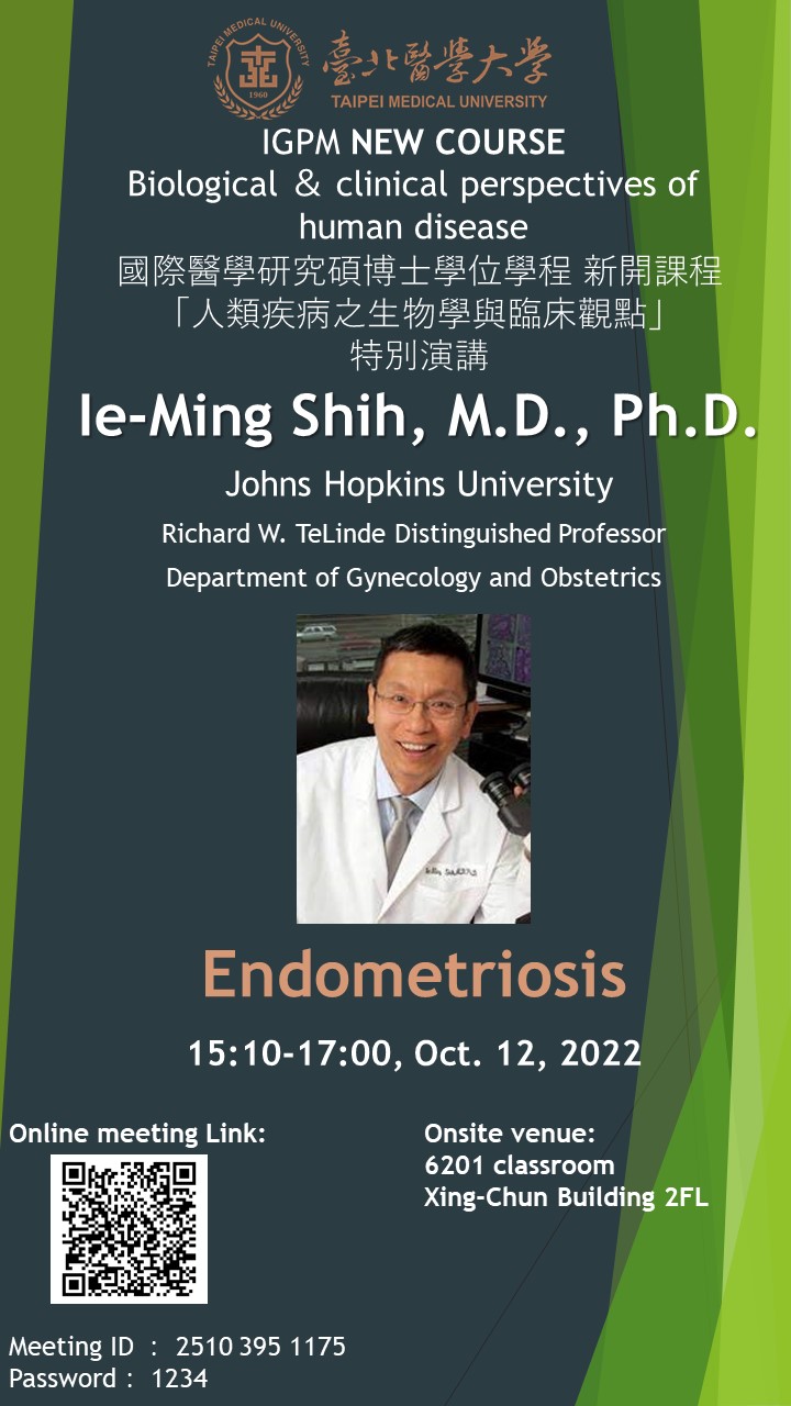 | Seminar Title | 國際學程施益民教授別演講[Endometriosis] Dr. Ie-Ming Shih special lecture [Endometriosis] |