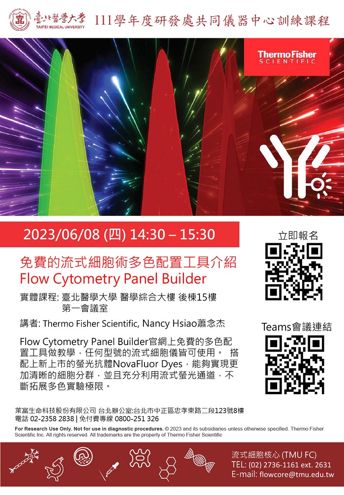| 研讨会名称 | 112/06/08-Attune NxT声波聚焦流式細胞分析仪训练课程-Flow Cytometry Panel Builder多色配置工具介绍 (中文)(14:30-15:30) |