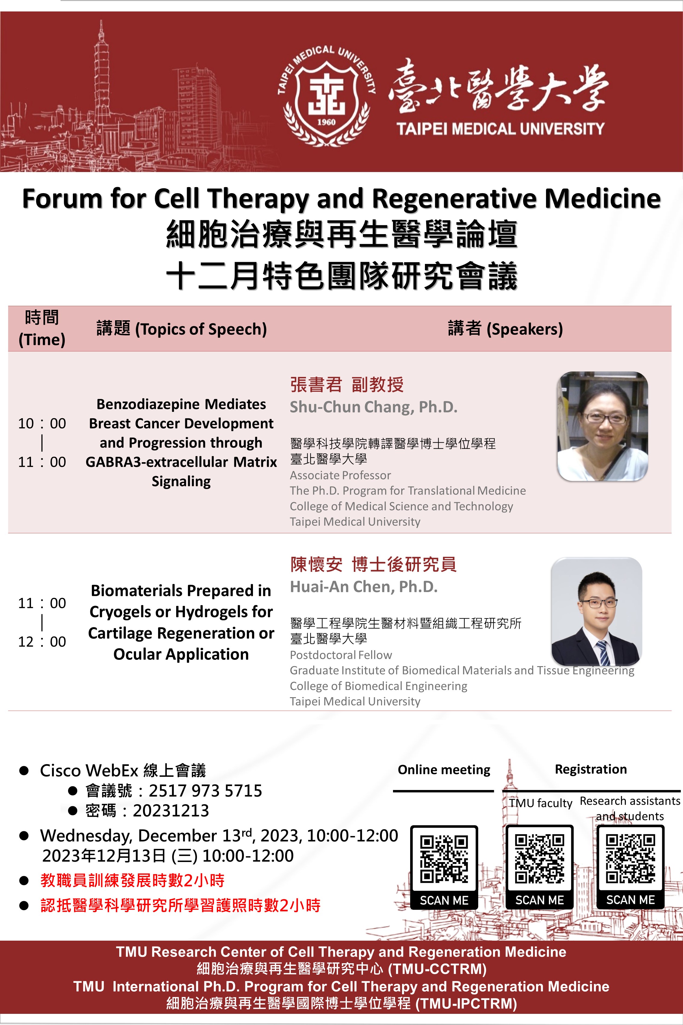 | 研討會名稱 | 20231213 細胞治療與再生醫學12月特色團隊會議 |