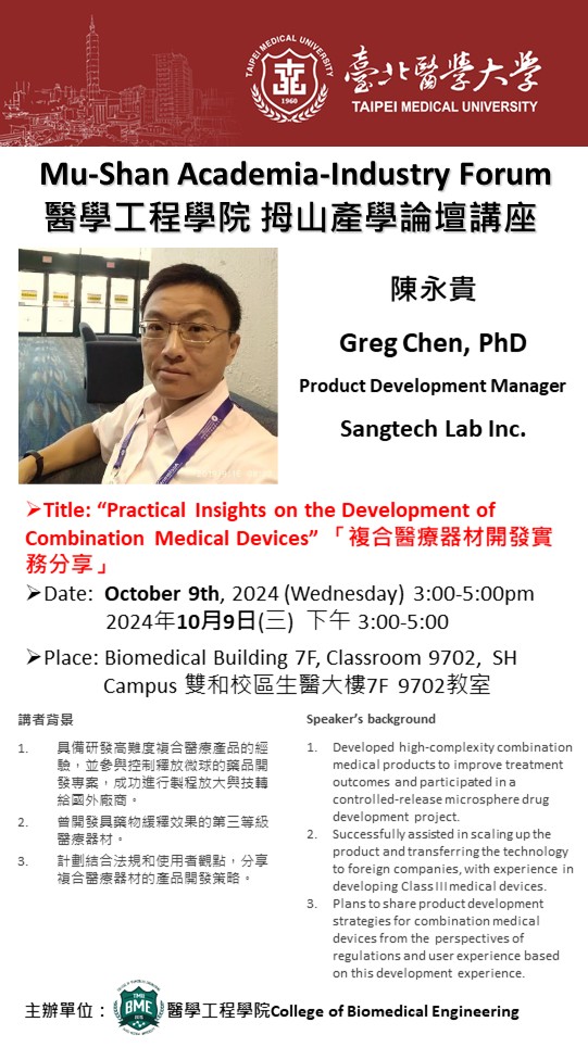 | 活動說明 | Practical Insights on the Development of Combination Medical Devices 複合醫療器材開發實務分享 Combination medical devices generally refer to medical devices that contain active ingredients. In cases of complex medical conditions, the use of combination medical devices often results in better treatment outcomes. With the expectations of both patients and physicians, how can engineers design combination medical devices that are both safe and effective, successfully pass various tests, and obtain sales approval from regulatory authorities. This lecture shares two types of combination medical devices, explaining the regulatory guidelines and the design planning. 複合醫療器材泛指包含活性成份之醫療器材,在複雜病症使用複合醫療器材通常能收到更好的治療效果。在病患與醫師期待之下,工程師如何設計出安全又有效的複合醫材,能順利通過各項檢測,並取得主管機關的販售許可。 本次演講分享兩種複合醫療器材,說明法規規範及開發者設計規劃。 |