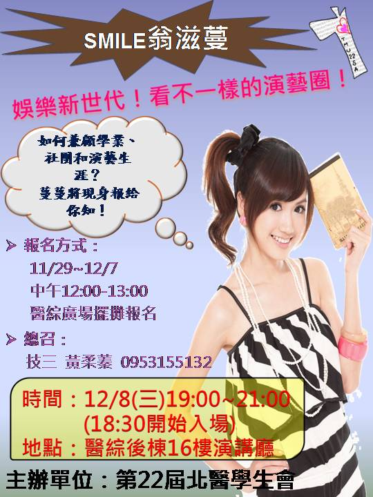 | 研讨会名称 | 12/8(W3) 【名人演讲-翁滋蔓】Smile翁滋蔓!娱樂新世代,看不一样的演艺圈! |
