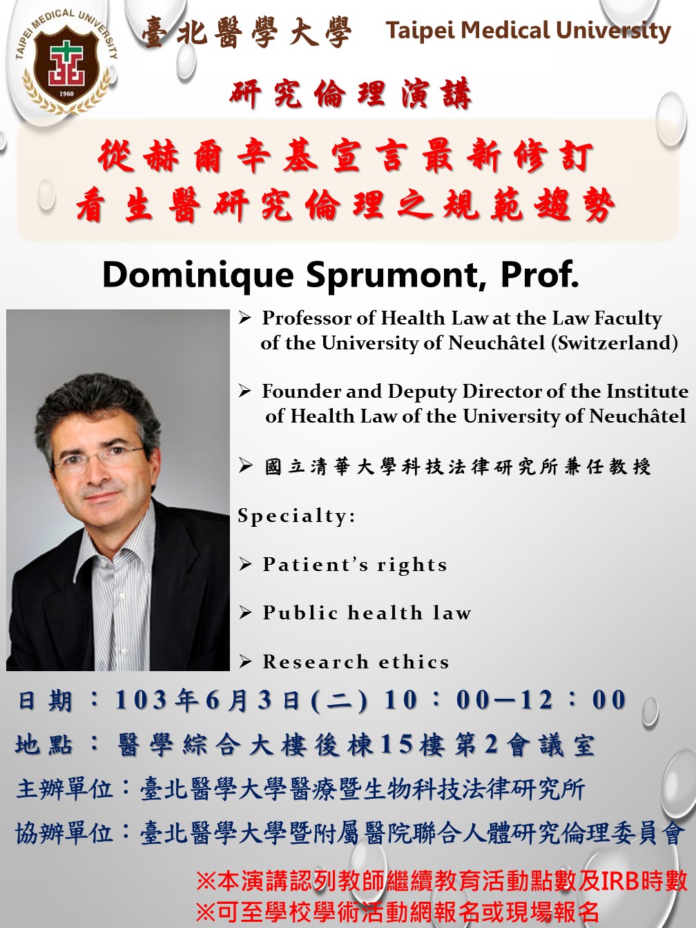 | 活動說明 | 赫爾辛基宣言是當代有關生醫研究倫理最重要之國際規範原則,在我國強調國際合作研究之背景下,深入了解該宣言最新修訂所呈現之趨勢,以避免我國學術界與歐洲合作過程出現倫理規範架構理解落差實有必要。Sprumont教授長期從事歐洲研究倫理教育,且在赫爾辛基宣言最近修訂過程亦參與甚多,其將以第一手經驗向本校相關研究者說明歐洲研究倫理之新趨勢。 時間:103年6月3日(二) 10:00─12:00 地點:醫學綜合大樓後棟15樓第二會議室 主辦單位:臺北醫學大學醫療暨生物科技法律研究所 協辦單位:臺北醫學大學暨附屬醫院聯合人體研究倫理委員會 ※本演講認列教師繼續教育活動點數及IRB時數 |