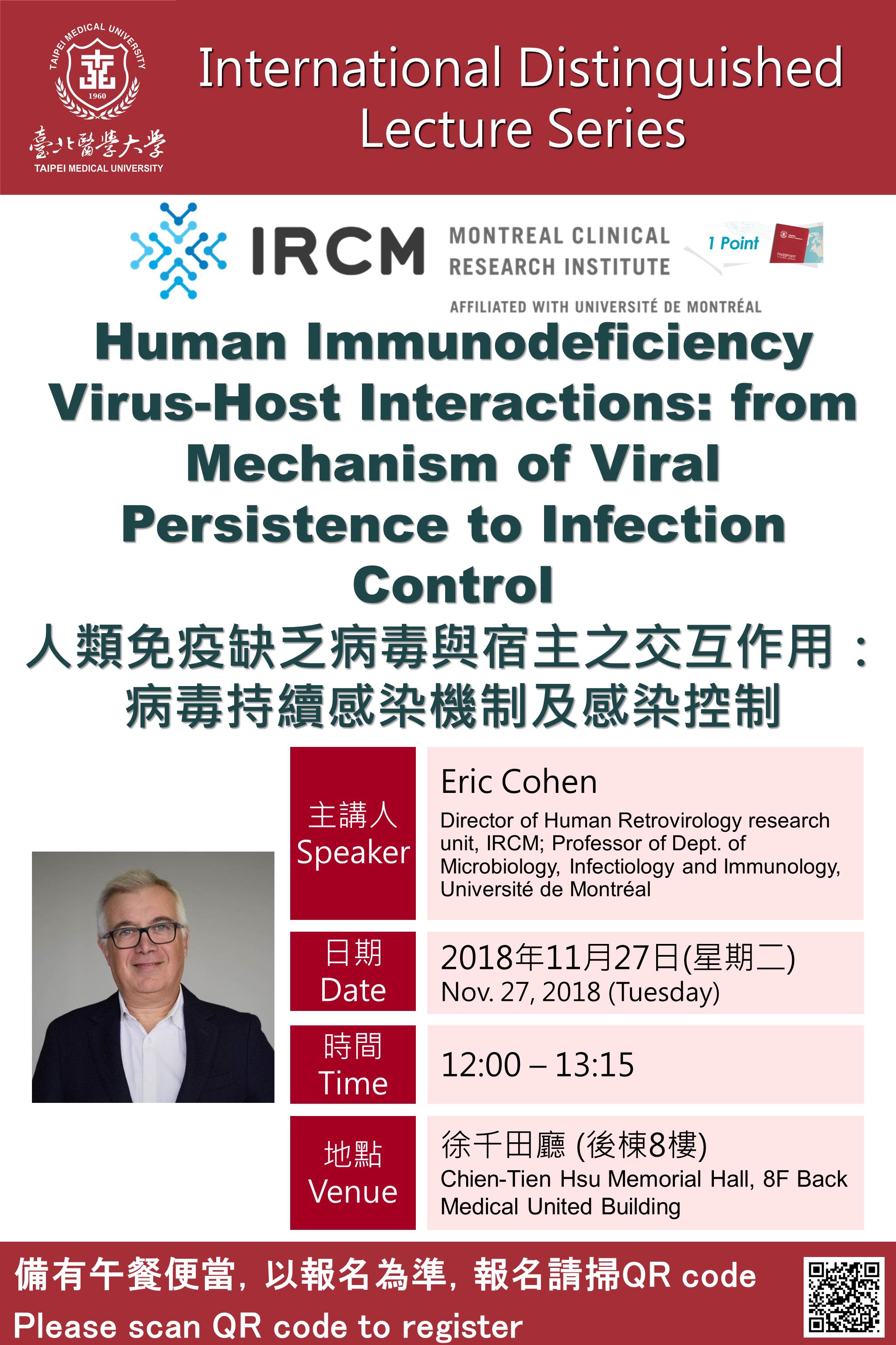 | 活動說明 | Title: Human Immunodeficiency Virus -Host Interactions: from Mechanism of Viral Persistence to Infection Control Speaker: Eric Cohen; Director of Human Retrovirology research unit, IRCM; Professor of Dept. of Microbiology, Infectiology and Immunology, Université de Montréal Vanue: Chien-Tien Hsu Memorial Hall, 8F Back Medical United Building (後棟8樓 徐千田廳) Date: Nov.27 (Tuesday) Time: 12:00-13:00 Lunch provided for registered attendees. |