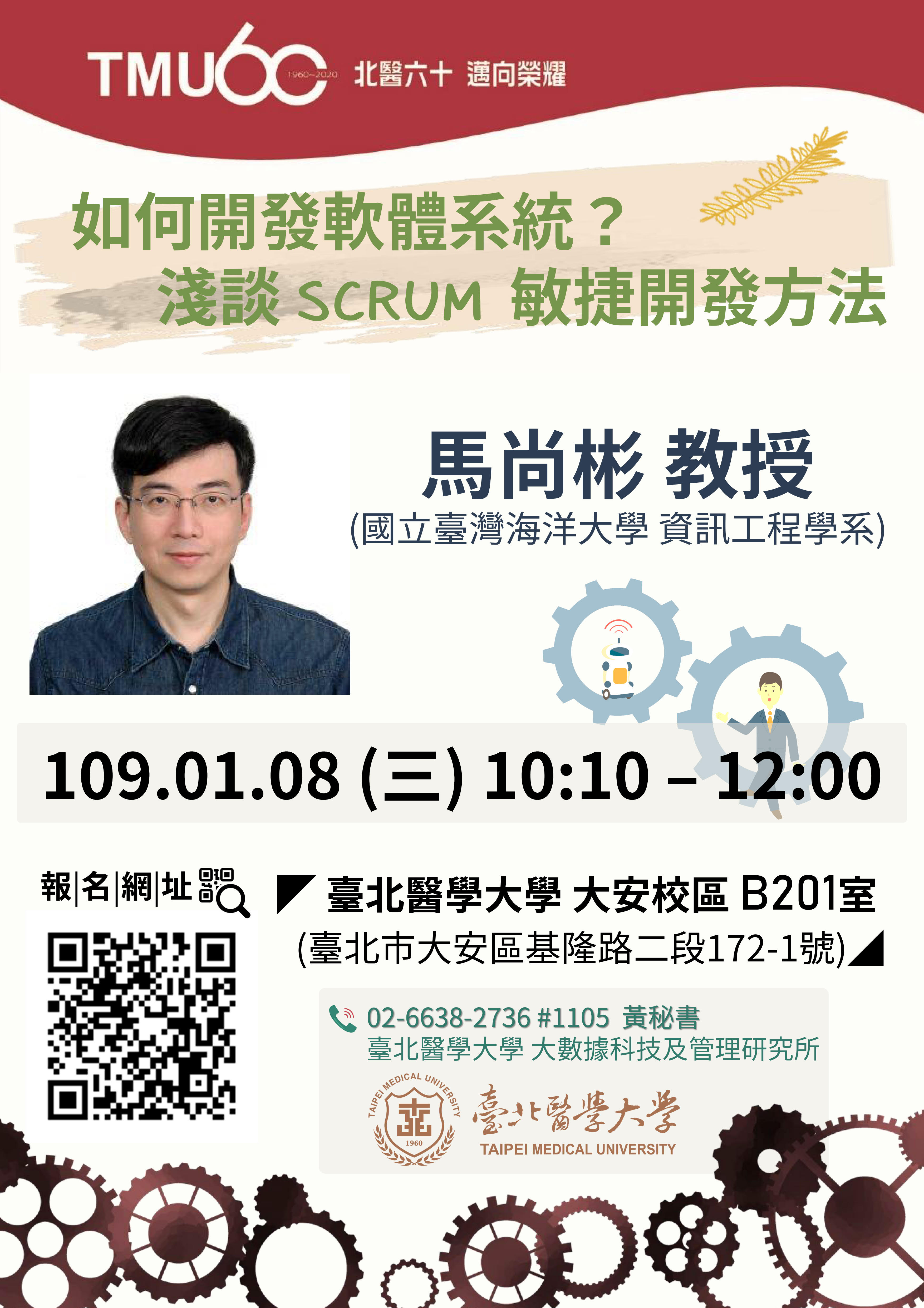 【演講】如何開發軟體系統?淺談SCRUM敏捷開發方法rn日期:2019/01/08(三)10:10-12:00rn地點:大安 B201rn講者:海洋大學資工系 馬尚彬 教授
