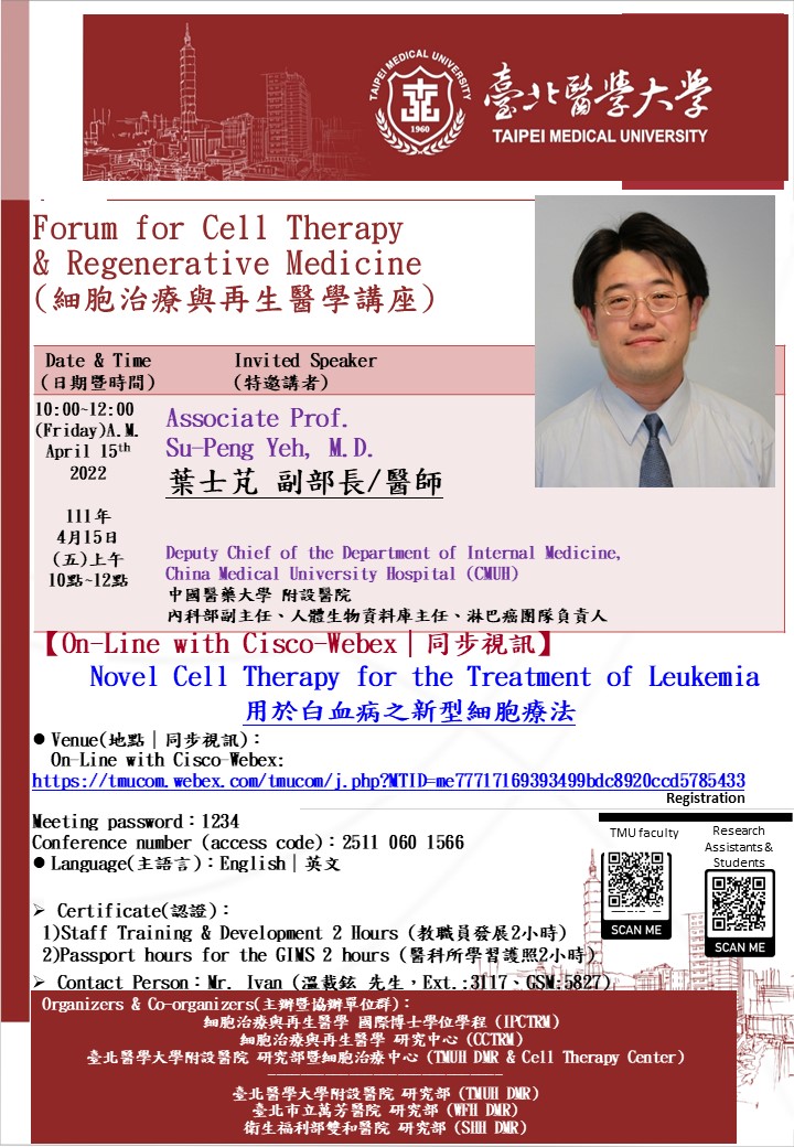 | Seminar Title | 葉士芃 副部長/副教授|Novel Cell Therapy for the Treatment of Leukemia |