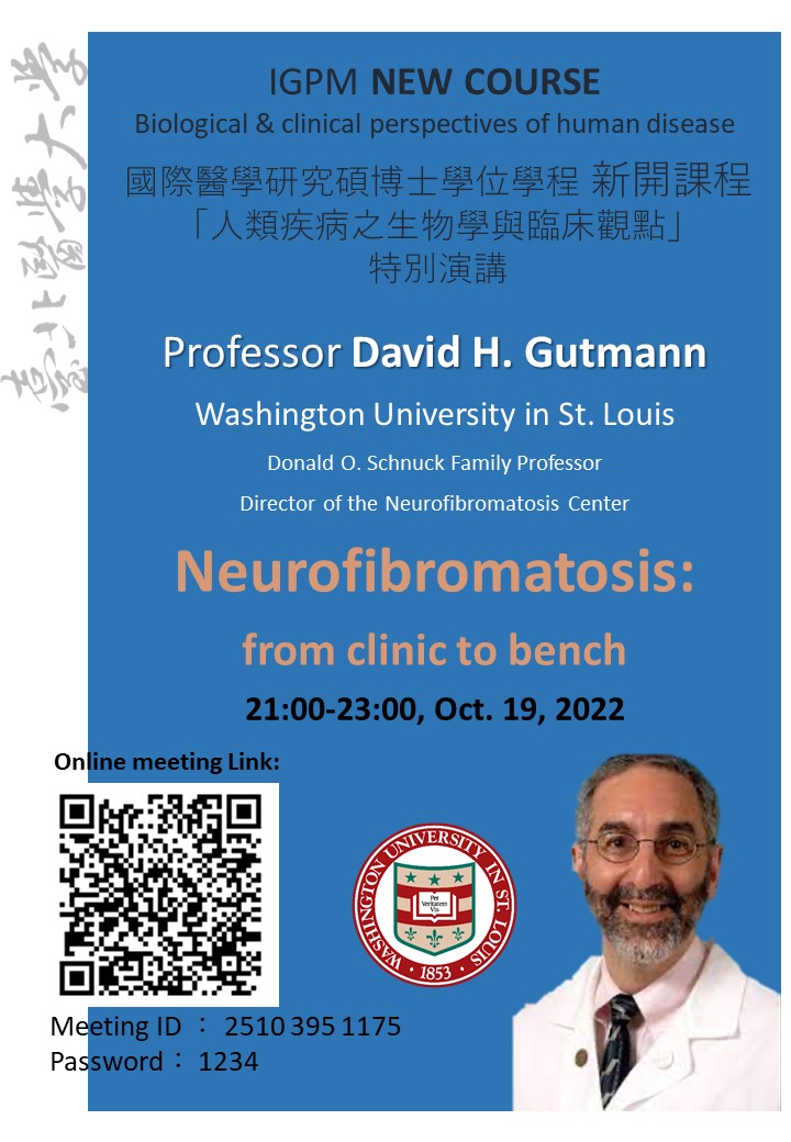 | 研討會名稱 | 2022/10/19 Professor David H. Gutmann 特別演講 [Neurofibromatosis: from clinic to bench] |