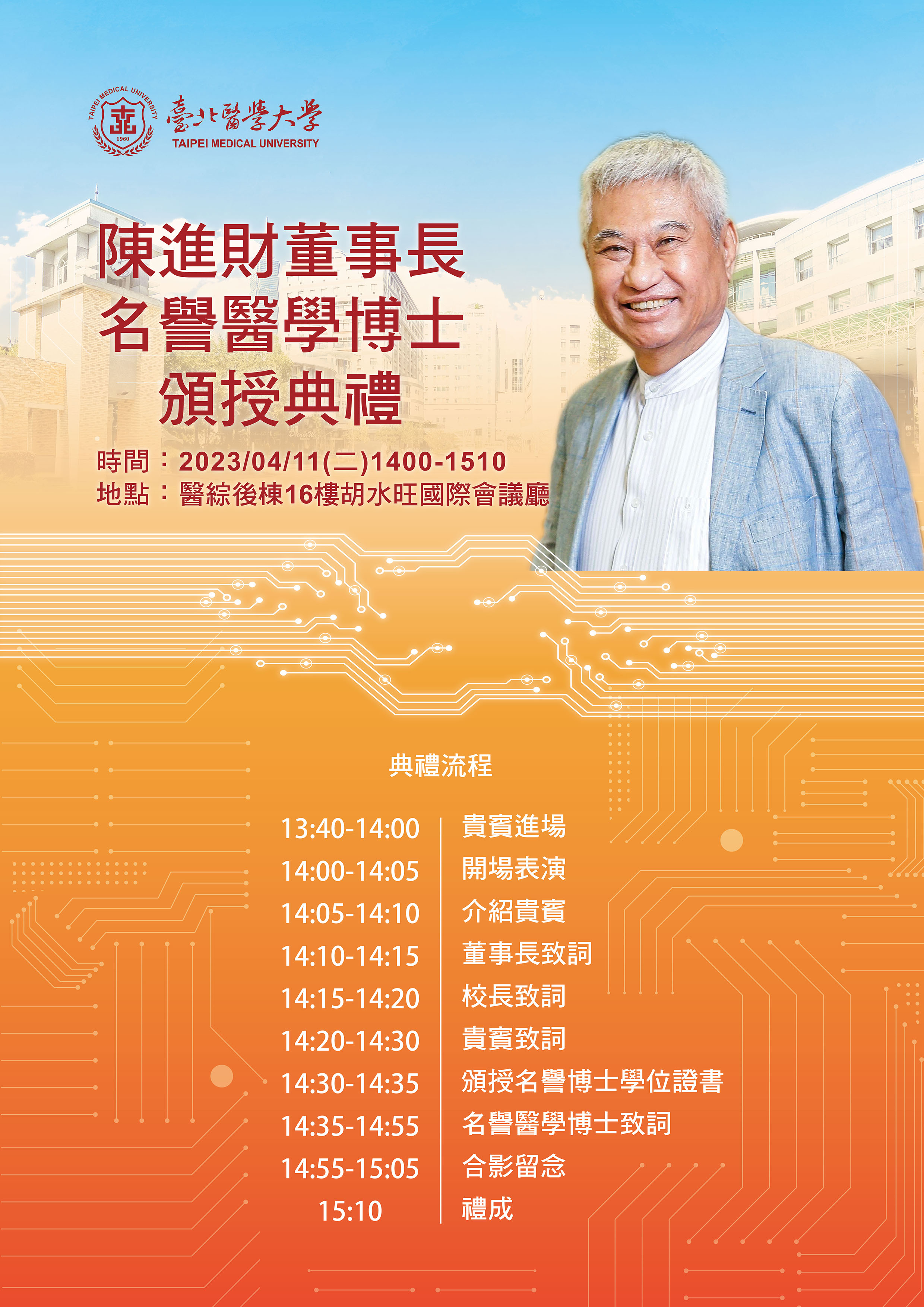 | 活动说明 | 本校将颁授崇高的名誉博士學位予稳懋半导体陈进财董事长。稳懋现为全球最大的化合物半导体晶圆廠,陈董事长从财会、传统产业再转进科技传统产业,并跨足生技产业,推广5G结合远距医療发展优势,翻转偏乡医療。 此外,陈董事长也重视企业永續发展,致力于节能减碳净零排等目标,也推动各项人才发展策略,持續为台湾培育半导体产业人才,強調「关怀社会」、「人才培育」與「环境保护」,與台北医學大发展的核心价值不谋而合。近年與本校共同合作,从产碩专班到衍生新创,提供全方位的癌症、基因检测服务,为预防医學、精准医療贡献更多心力。 敬邀北医大体系教职员生踊跃报名参加!! 【陈进财董事长名誉医學博士颁授典礼】 时间:2023/4/11(二)14:00(敬请提前13:40入座) 地点:信义校区医學综合大楼後栋16楼胡水旺国際会议厅 |