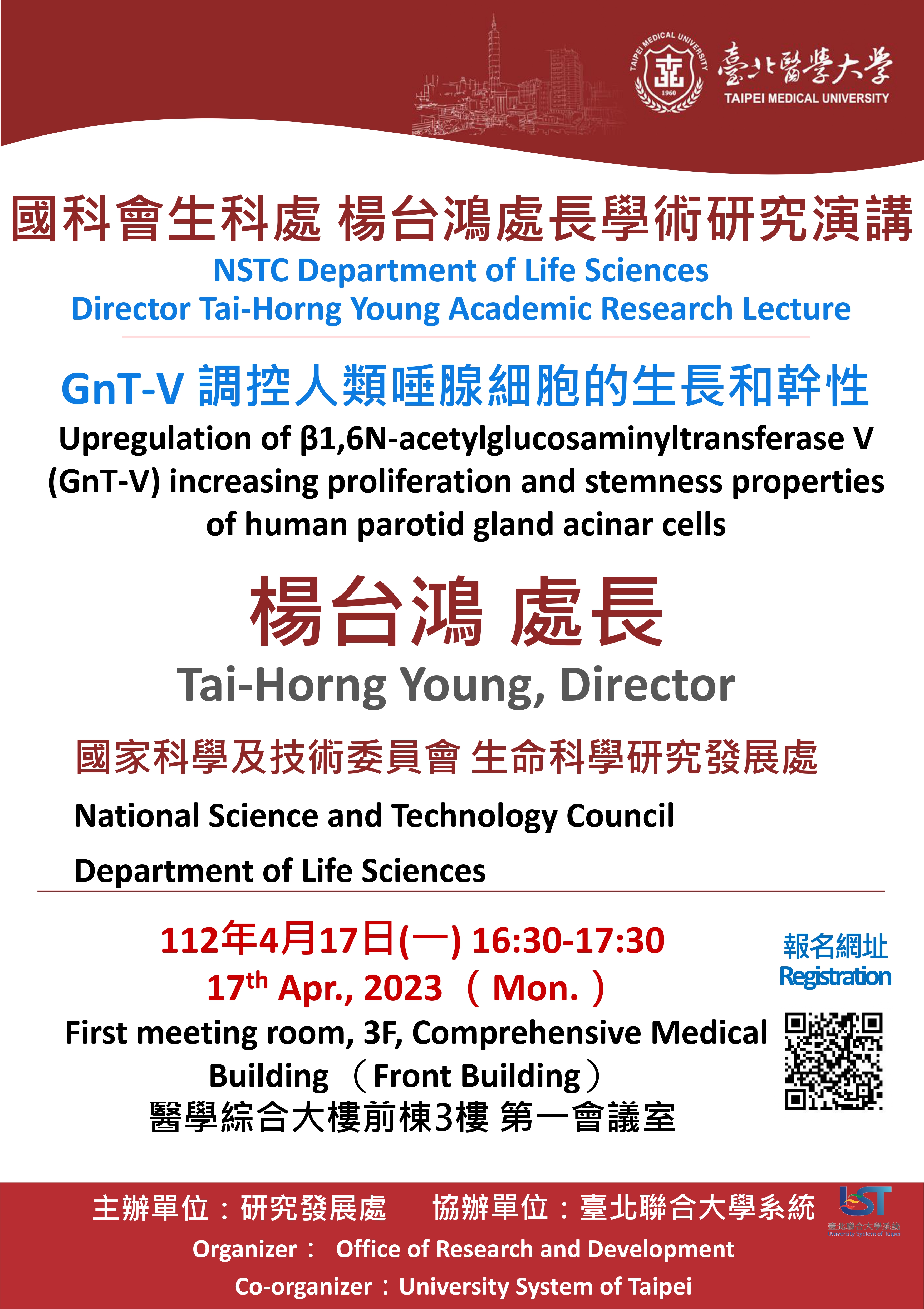 112/4/17(一)國科會生科處 楊台鴻處長學術研究演講(16:30-17:30 醫學綜合大樓後棟16樓 胡水旺國際會議廳)