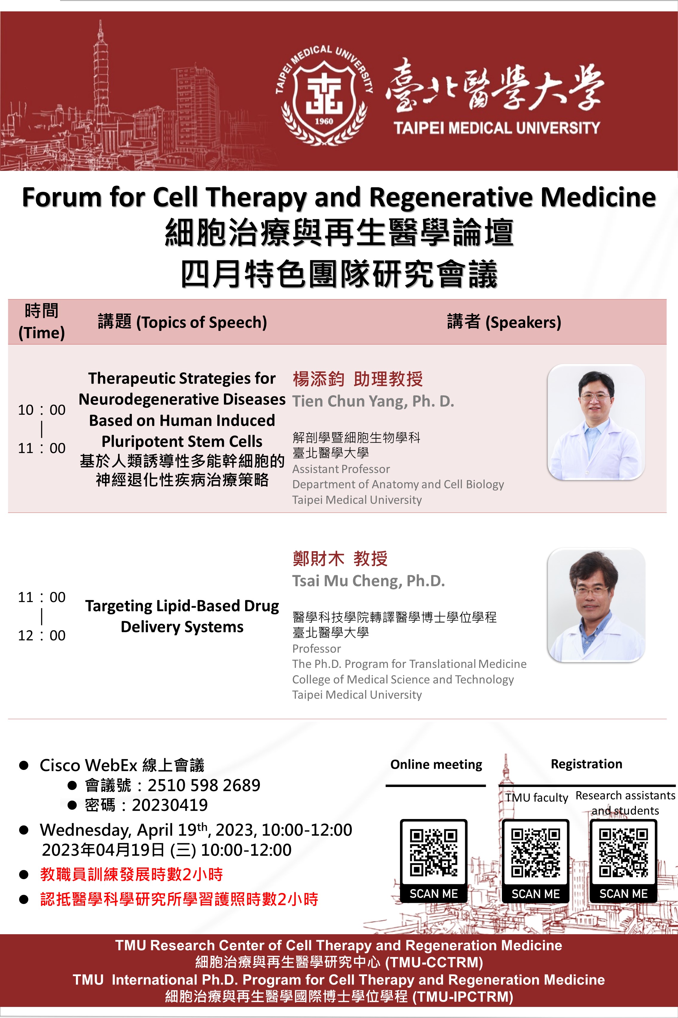 | 研讨会名称 | 20230419 細胞治療與再生医學04月特色团队会议 |