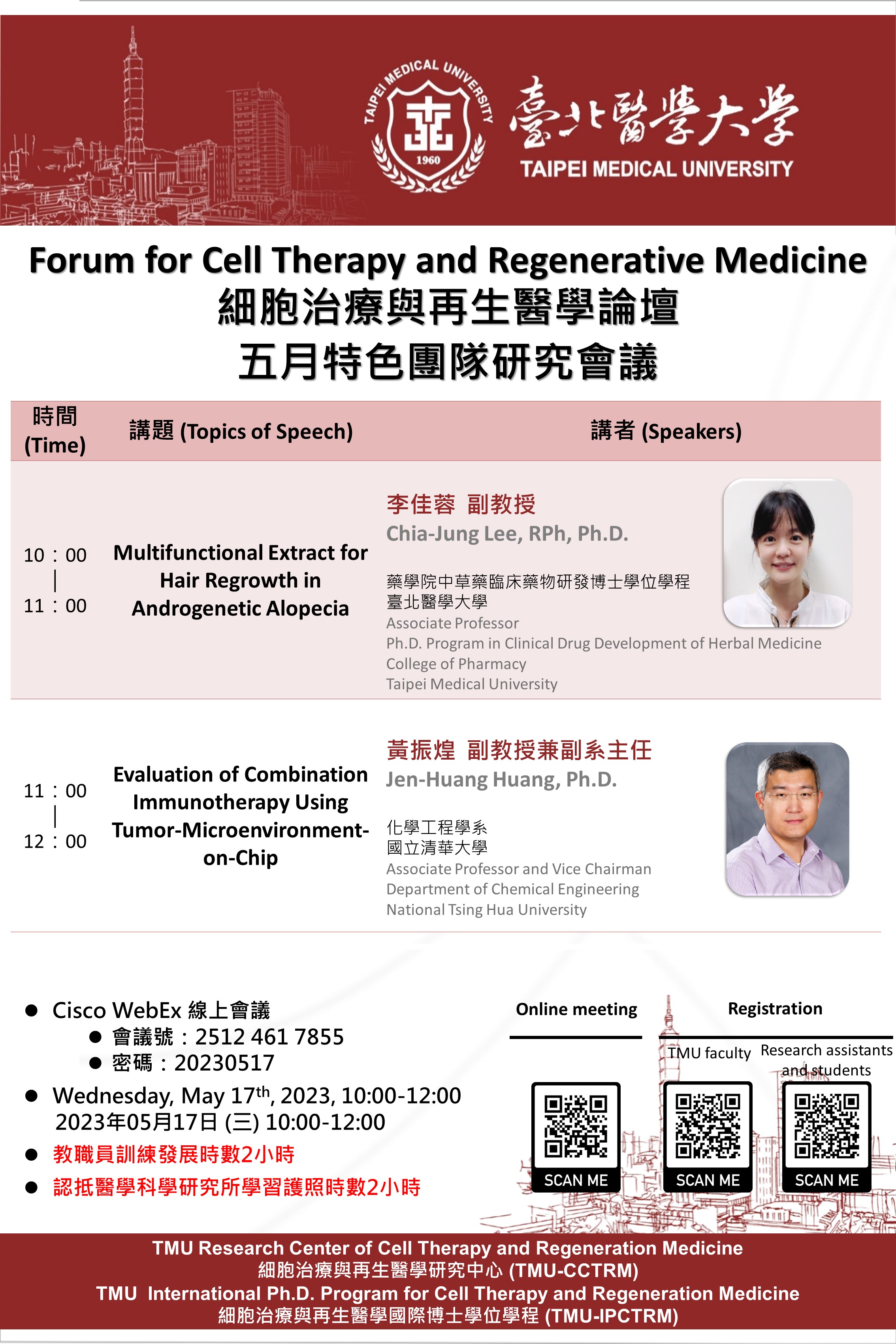 活動說明五月份細胞治療與再生醫學特色團隊研究論壇很榮幸邀請到 中草藥臨床藥物研發博士學位學程 李佳蓉副教授及國立清華大學化學工程學系 黃振煌副教授兼副系主任 與各位先進分享:
