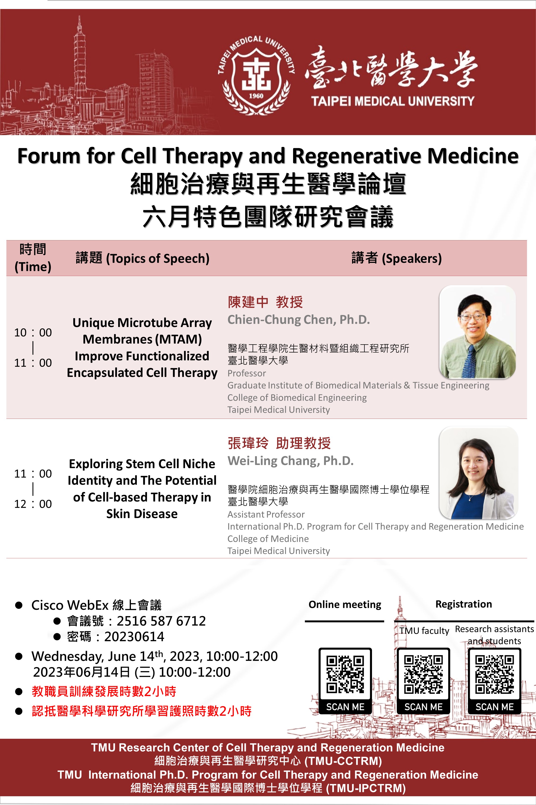 | 研讨会名称 | 20230614 細胞治療與再生医學06月特色团队会议 |
