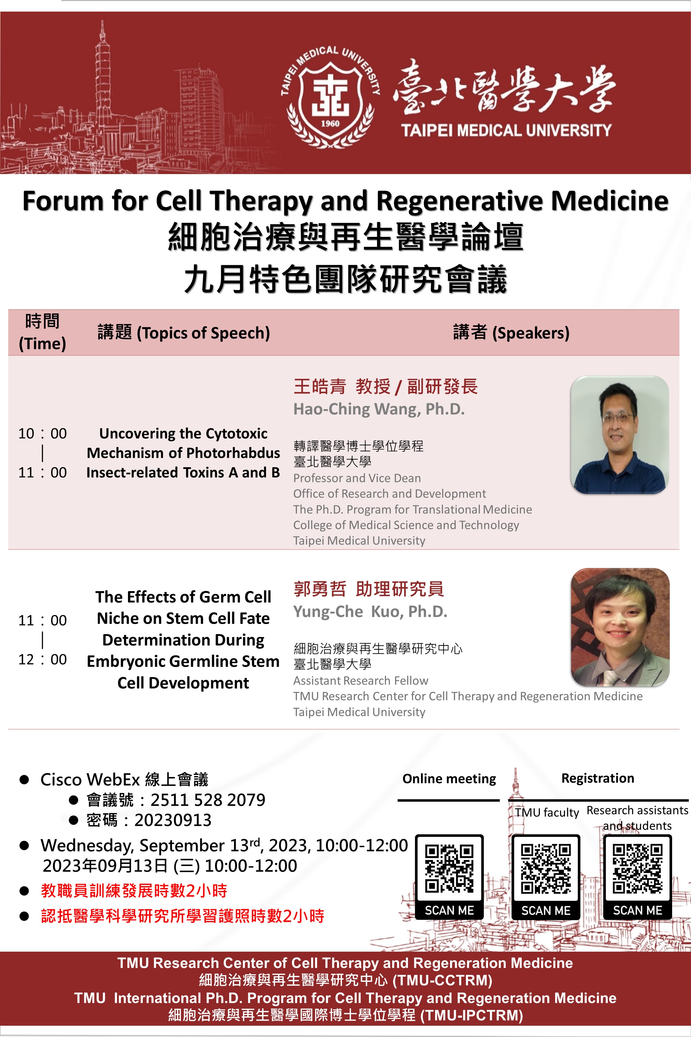 | 研讨会名称 | 20230913 細胞治療與再生医學09月特色团队会议 |
