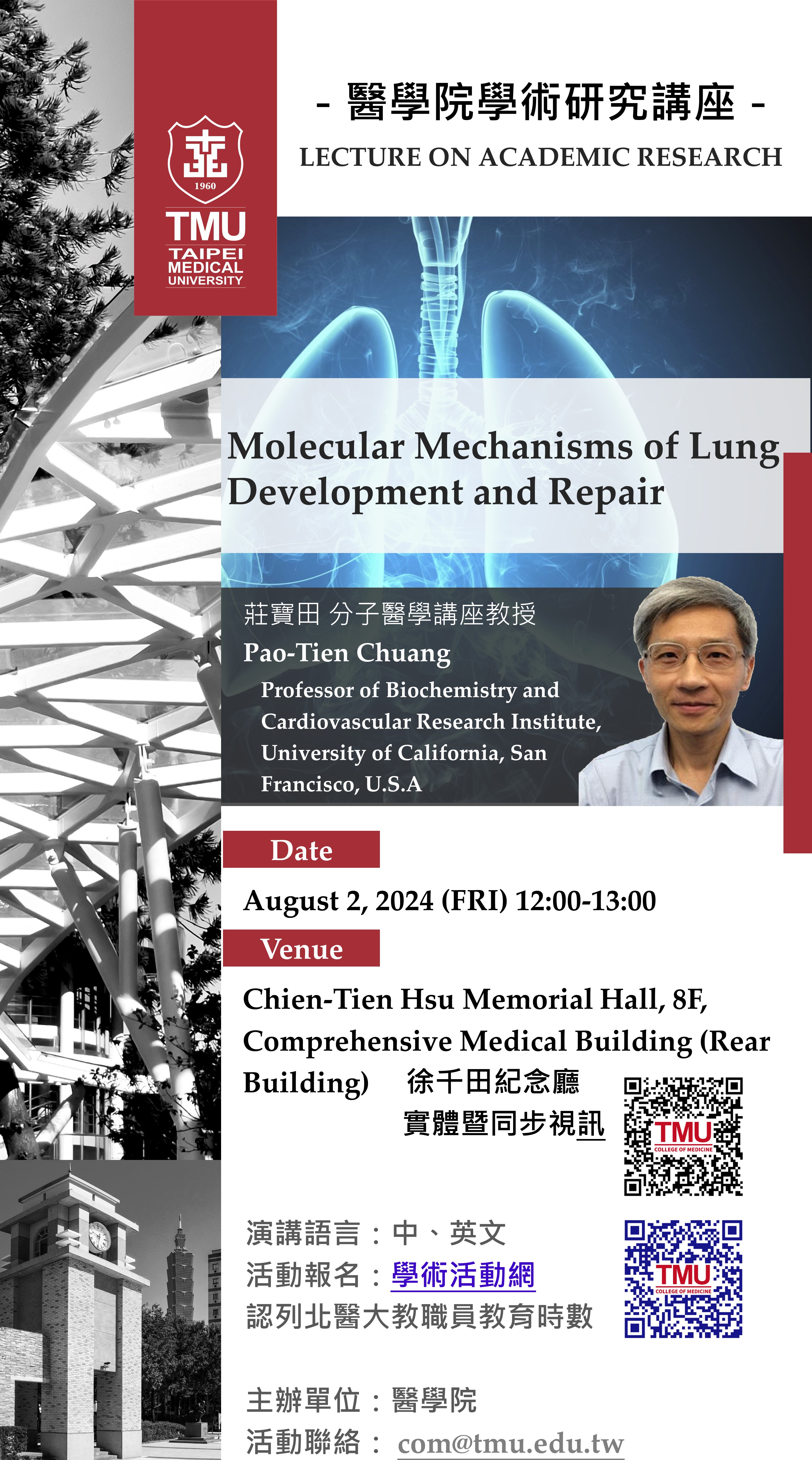 研討會名稱【學術研究講座】美國UCSF莊寶田教授 | Molecular Mechanisms of Lung Development and Repair