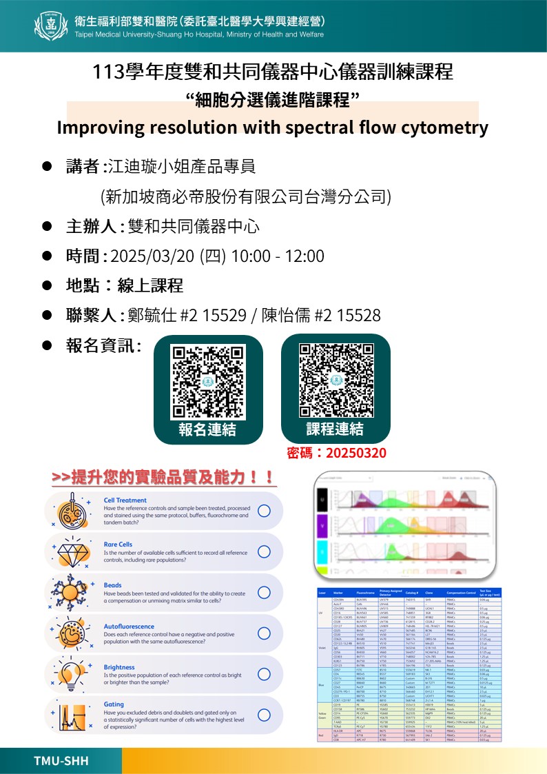 研讨会名称113學年度双和共同仪器中心仪器训练课程 - 細胞分选仪进阶课程(双和)