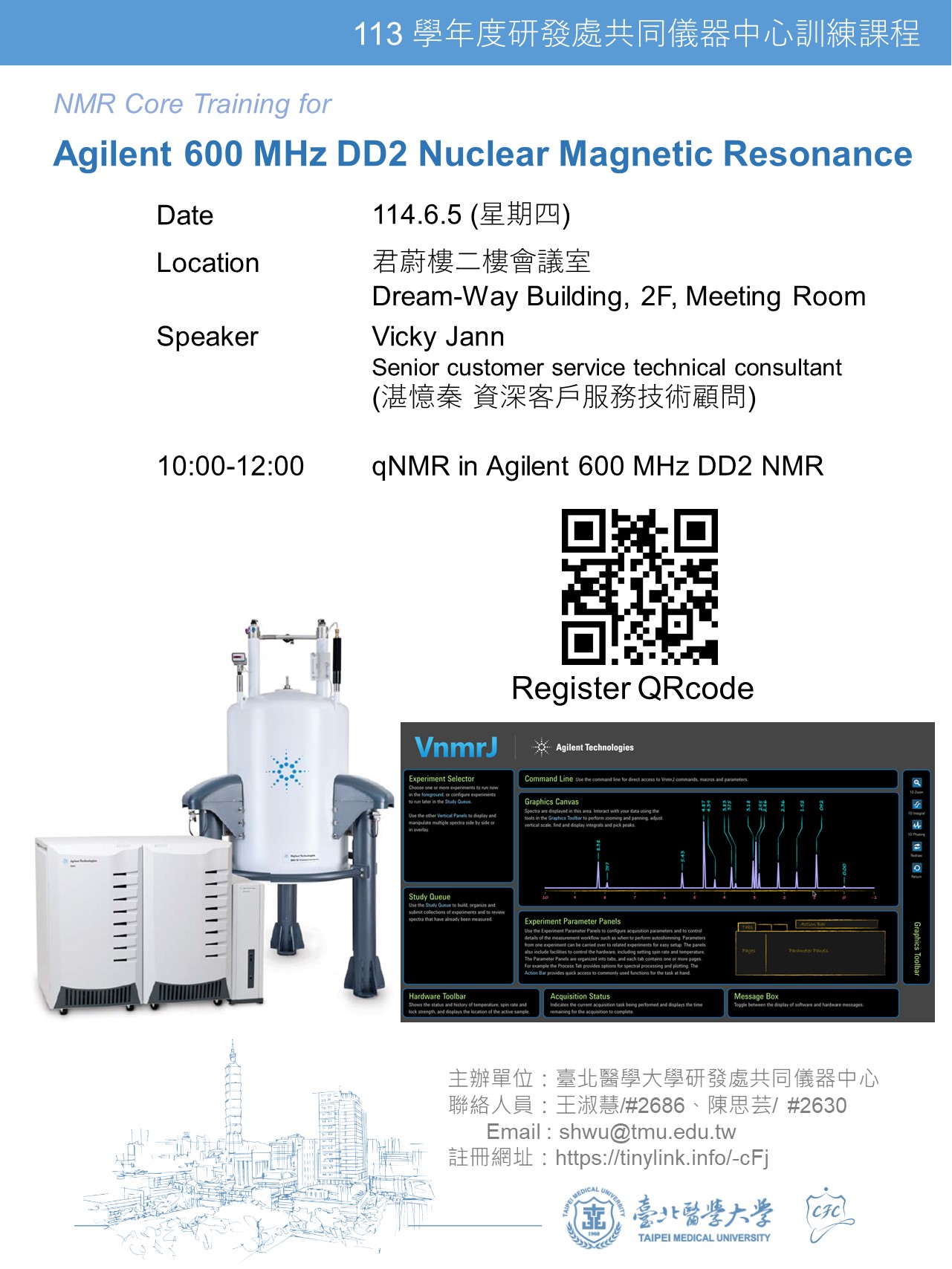 | 研討會名稱 | 114/06/05-Agilent DD2 600 MHz NMR 儀器訓練課程 (中文)(10:00-12:00) |