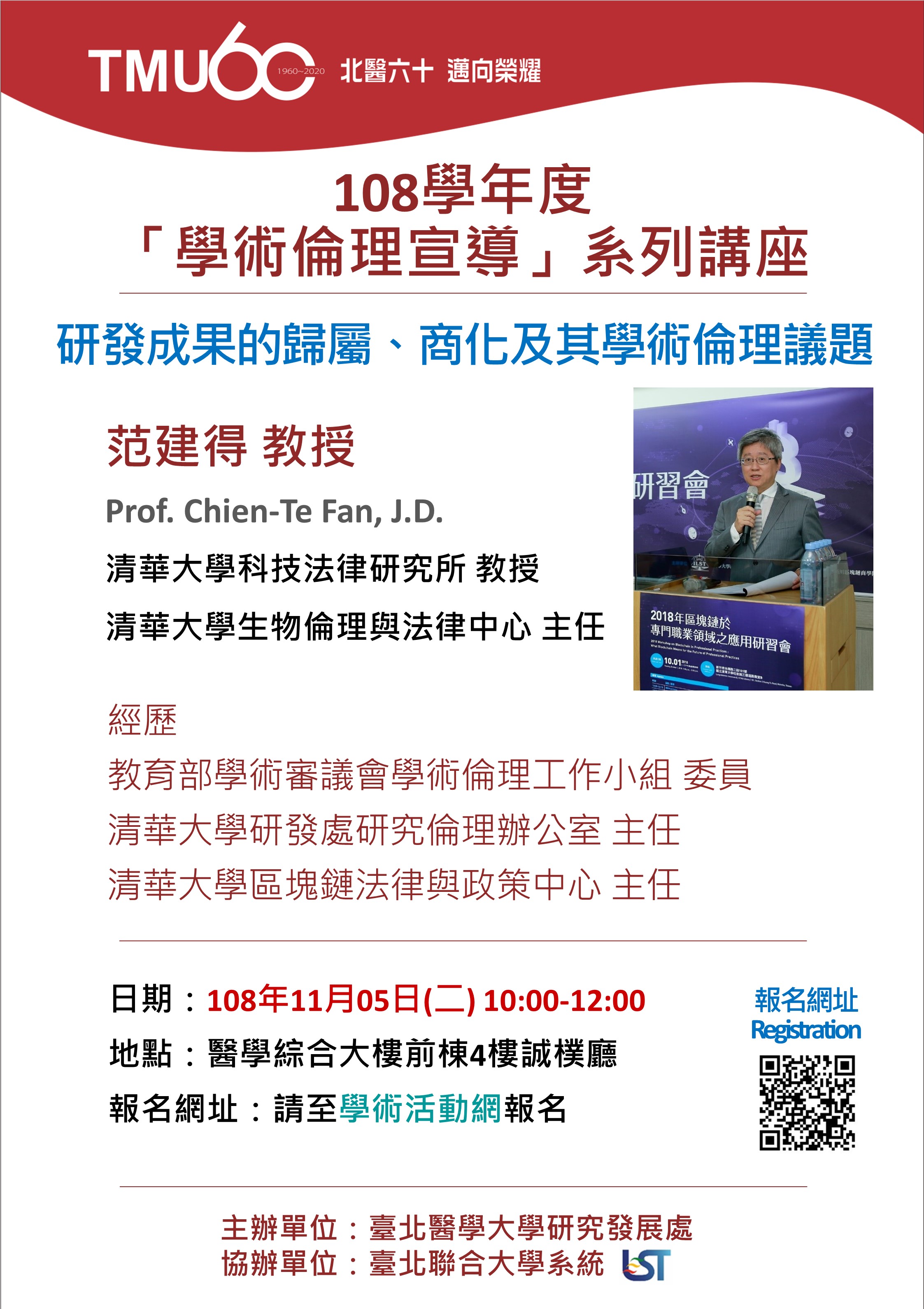 108學年度「學術倫理宣導」系列講座-108/11/05(二) - 國立清華大學范建得教授【研發成果的歸屬、商化及其學術倫理議題】(10:00-12:00 前棟4樓誠樸廳)
