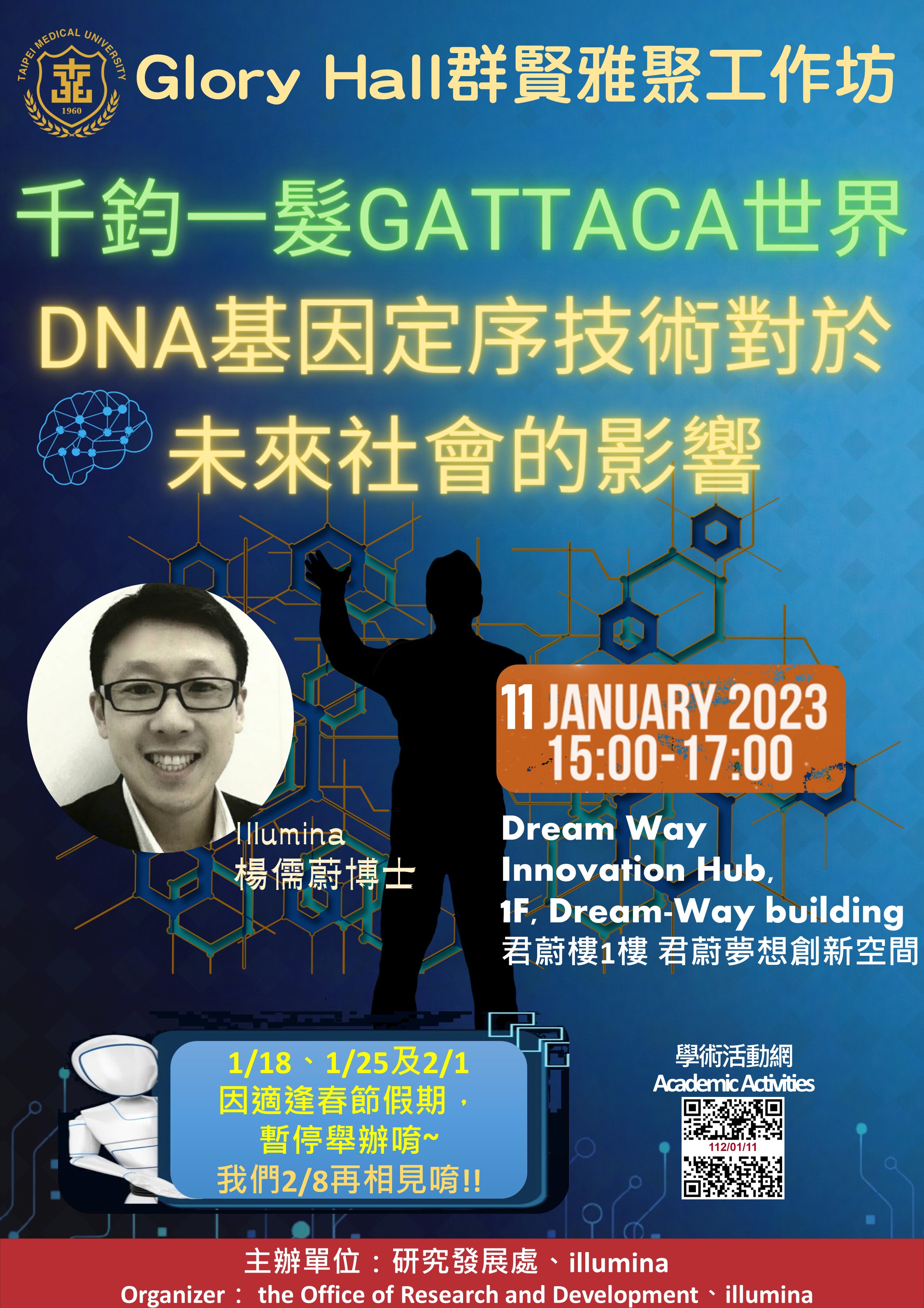 111學年度「Glory Hall群賢雅聚工作坊」-112/01/11(三)-illumina 楊儒蔚博士-「千鈞一髮Gattaca世界,DNA基因定序技術對於未來社會的影響」(1500-1700君蔚樓1樓君蔚夢想創新空間)