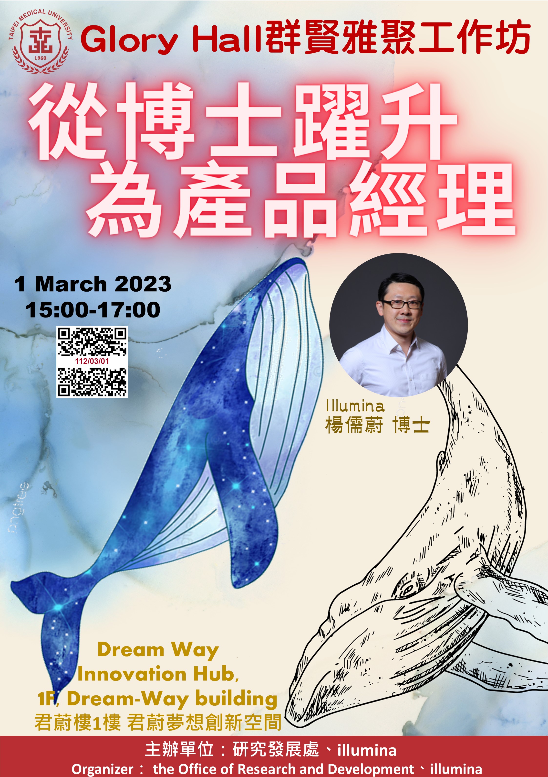 111學年度「Glory Hall群賢雅聚工作坊」-112/03/01(三)-illumina 楊儒蔚博士-「從博士躍升為產品經理」(1500-1700君蔚樓1樓君蔚夢想創新空間)