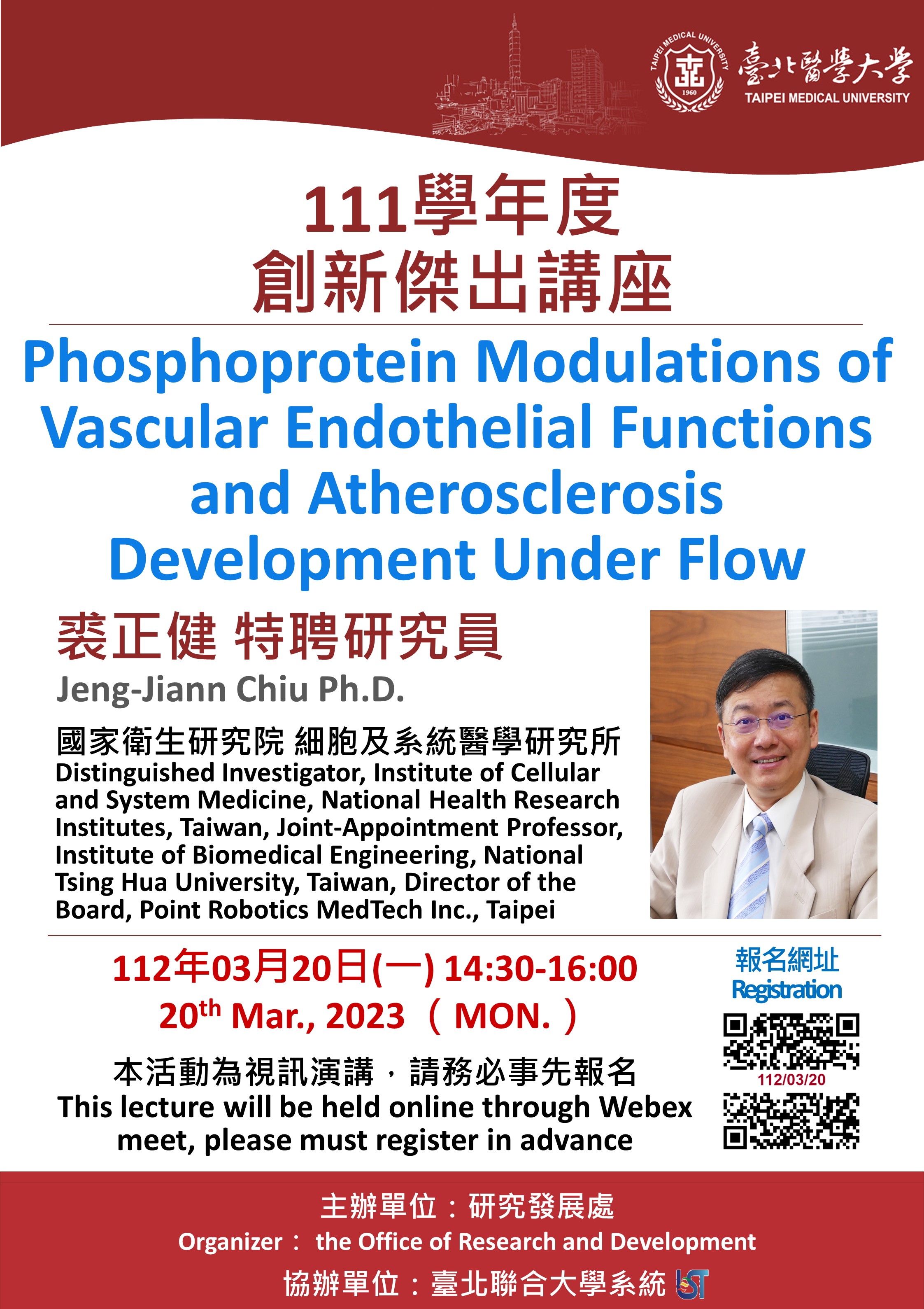 111學年度「創新傑出講座」-112/03/20(一) -國衛院 裘正健特聘研究員-「Phosphoprotein Modulations of Vascular Endothelial Functions and Atherosclerosis Development Under Flow」(1430-1600 視訊演講)