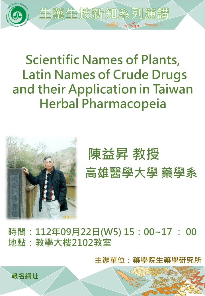 【生药生技新知系列演讲】陈益昇教授~ Scientific Names of Plants, Latin Names of Crude Drugs and their Application in Taiwan Herbal Pharmacopeia