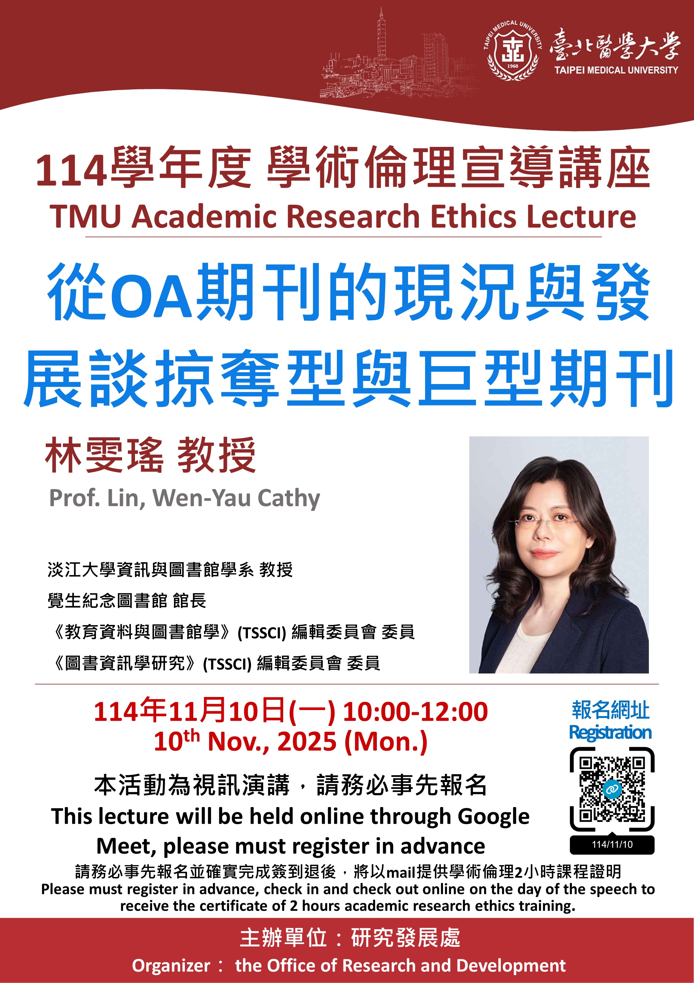 114學年度「學術倫理宣導講座」114/11/10(一) -淡江大學 林雯瑤教授/館長-「從OA期刊的現況與發展談掠奪型與巨型期刊」(10:00-12:00 視訊演講)
