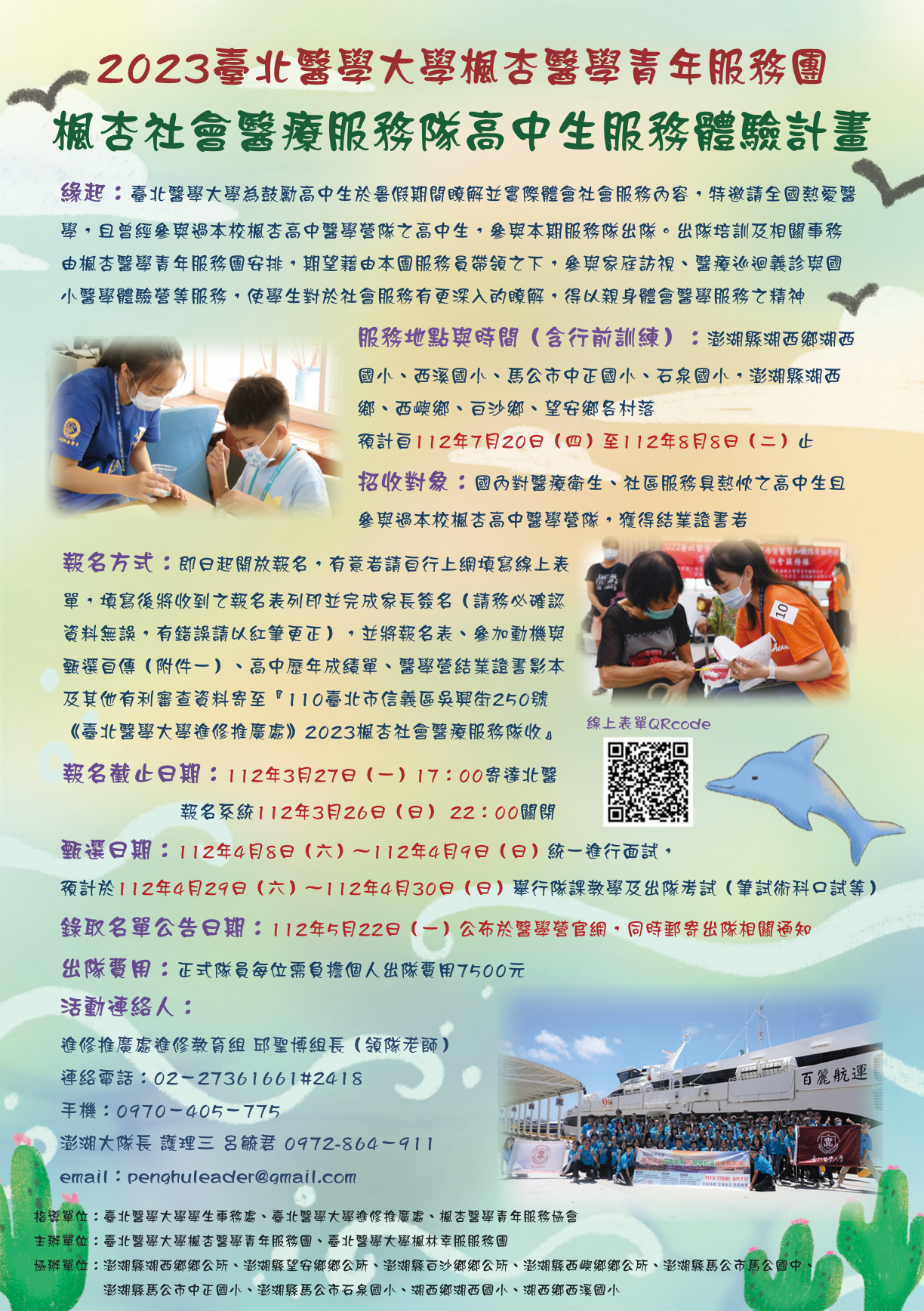 | 標題 | 2023臺北醫學大學楓杏醫學青年服務團 楓杏社會醫療服務隊高中生服務體驗計畫 |