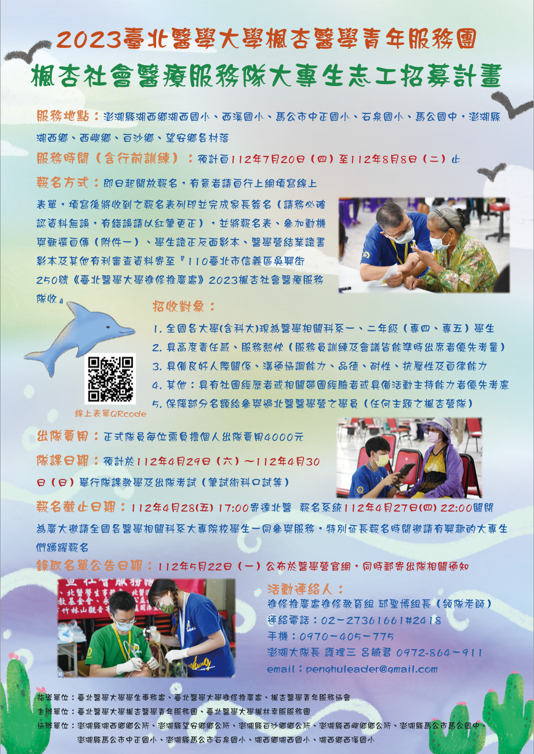 | 標題 | 2023臺北醫學大學楓杏醫學青年服務團 楓杏社會醫療服務隊大專生志工招募計畫 |