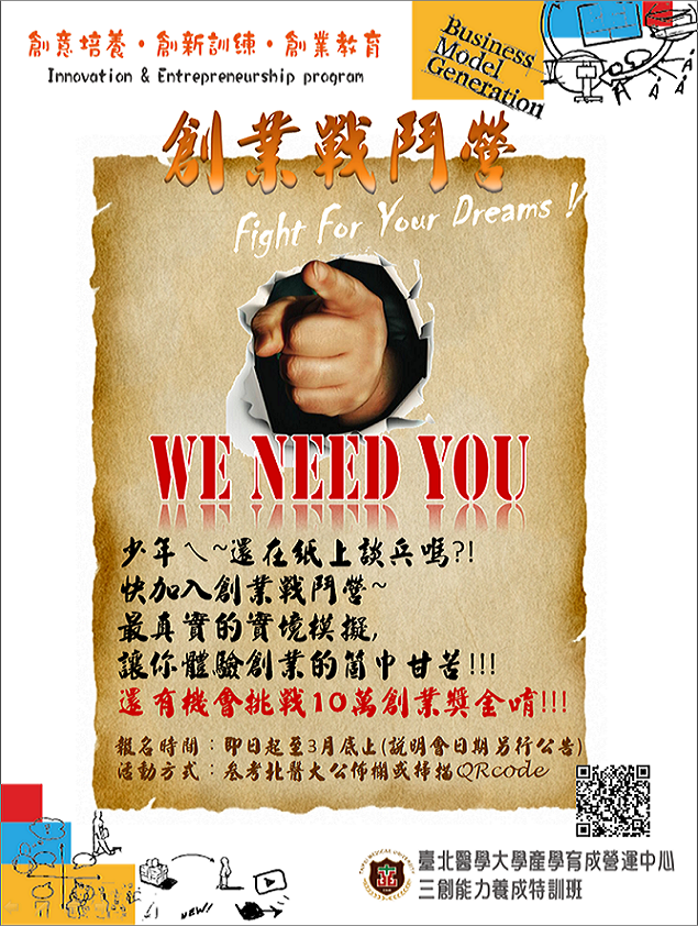 | 內容 | 『創業戰鬥營&第一屆創業之星擂台賽』即日起至4/10止接受報名。 →活動說明資訊 →報名表 (請將報名表送至產學育成營運中心或E-mail至ya-hui@tmu.edu.tw) ![]() |