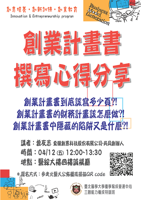 创业教育系列─04/12(五)12:00~13:30 『创业计畫書撰写心得分享』欢迎踊跃报名~~