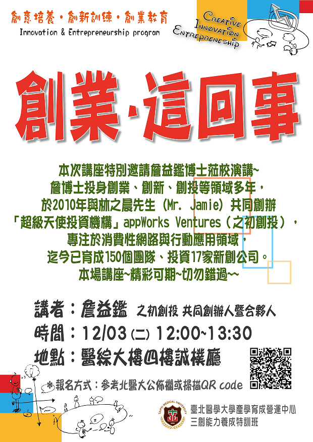 标题创意培养系列─12/03(二)12:00~13:30 『创业‧这回事』欢迎踊跃报名~~