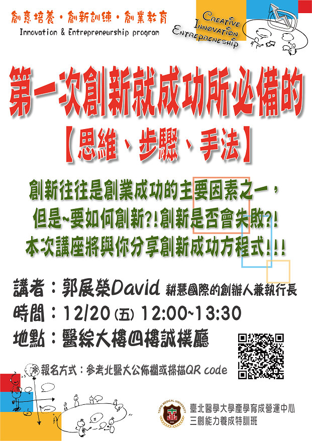 創新訓練系列─12/20(五)12:00~13:30 『第一次創新就成功所必備的【思維、步驟、手法】』歡迎踴躍報名~~