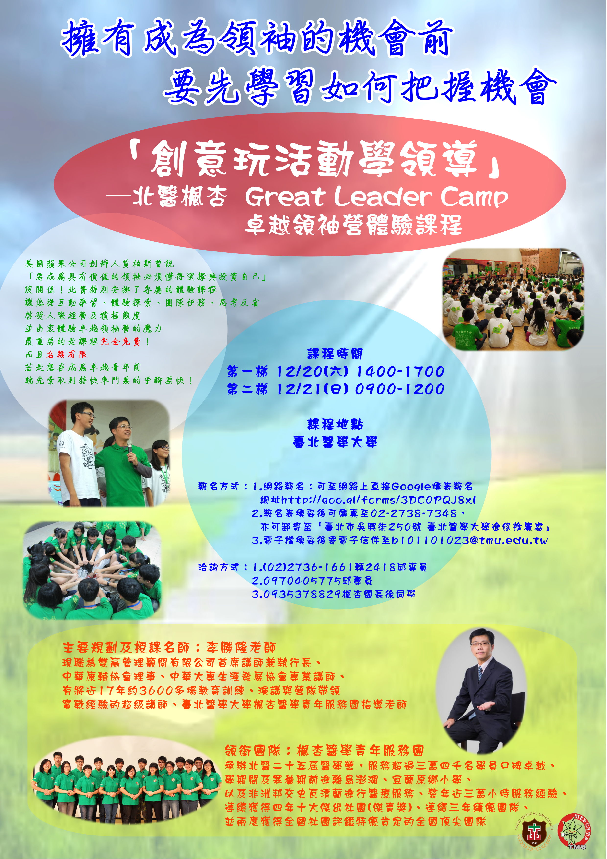臺北醫學大學 楓杏醫學青年服務團 Great Leader Camp卓越領袖營免費體驗課程 -「創意玩活動學領導」 擁有成為領袖的機會前,要先學會如何把握機會! 美國蘋果公司創辦人賈伯斯曾說 「要成為具有價值的領袖必須懂得選擇與投資自己」 北醫特別安排了專屬的體驗課程 讓您從互動學習、體驗探索、團隊任務及思考反省 啟發人際經營及積極態度 並由衷體驗卓越領袖營的魔力 最重要的是 課程完全免費! 名額有限,若是想在成為卓越青年前 就先索取到特快車門票的手腳要快! 一、 活動地點:臺北醫學大學 二、 活動時間: 1. 12/20(六)1400-1700,1330集合 2. 12/21(日)0900-1200,0830集合 共兩梯次 三、 活動費用:本體驗課程免費 四、 招生對象:國內外高中生與大學生一年級學生 五、 主辦單位:臺北醫學大學、臺北醫學大學進修推廣處 六、 承辦單位:臺北醫學大學楓杏醫學青年服務團 七、 營隊內容:
