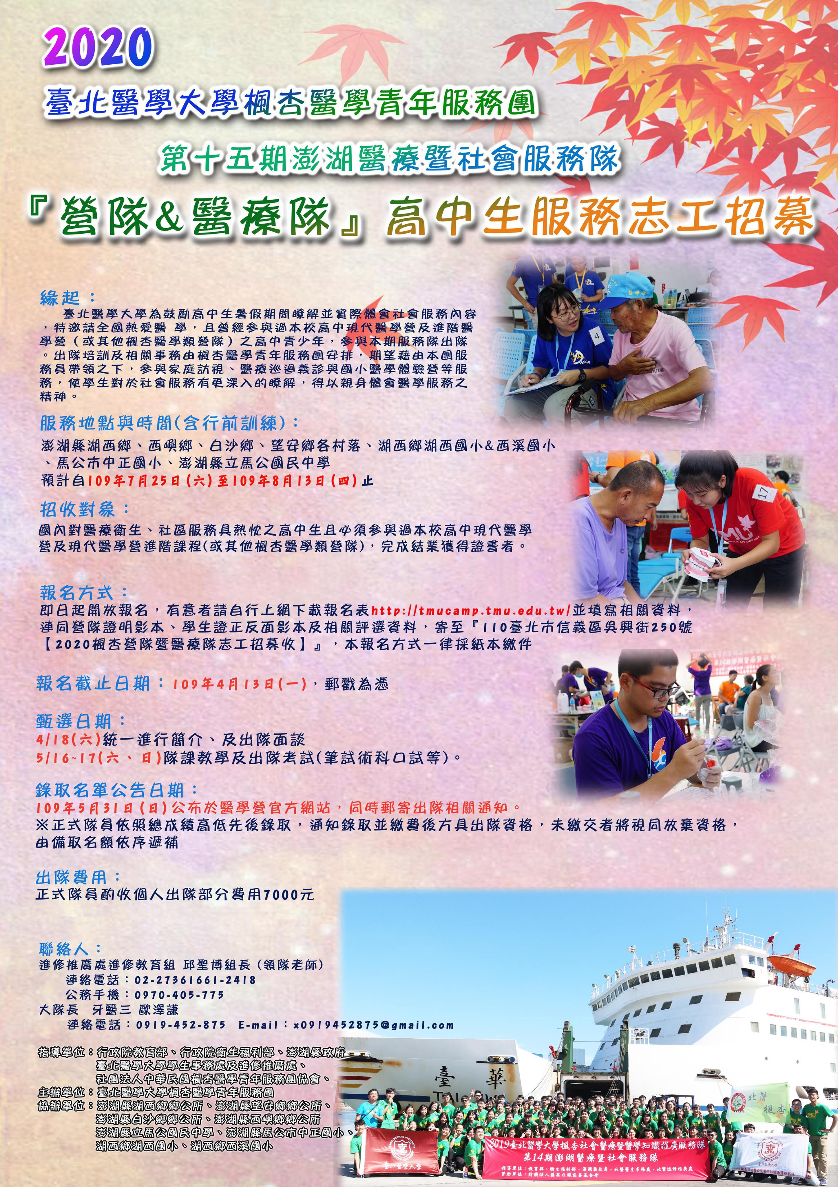 標題(2020暑期)第十五期澎湖社會醫療服務隊高中生服務體驗(因應疫情影響,計畫報名截止日期調整至4/13)