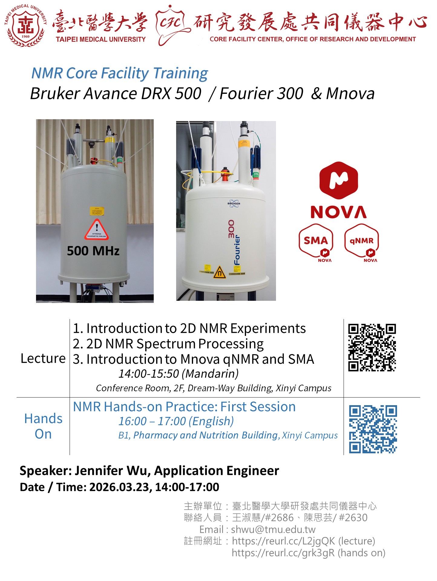 300 MHz NMR 上機操作訓練 (English)藥學暨營養大樓B1 共同儀器中心10位(已有0位報名)